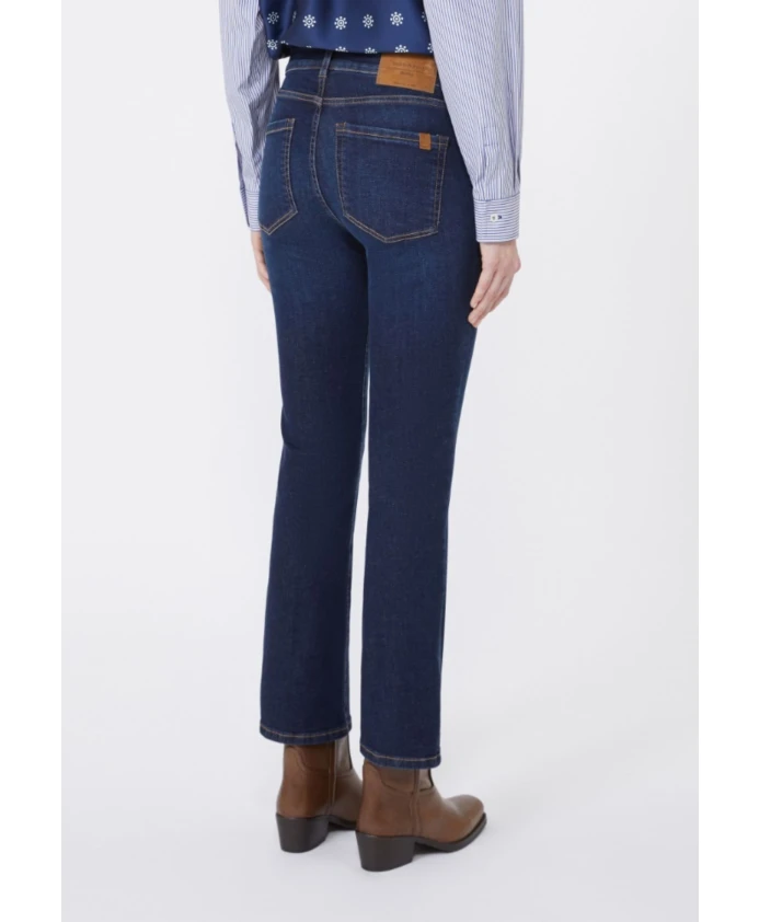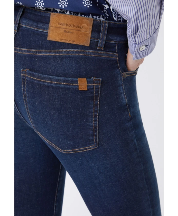 Джинсы-клеш Weekend Max Mara для женщин. Ультраузкие джинсы длиной до щиколотки со слегка расклешенным низом. Изготовлены из очень эластичного хлопкового денима. Имеют потайную застежку на молнию и пуговицу, 5 карманов, логотип в виде бабочки на правом заднем кармане и петли для ремня. Состав ткани: 98% хлопок, 2% эластан.