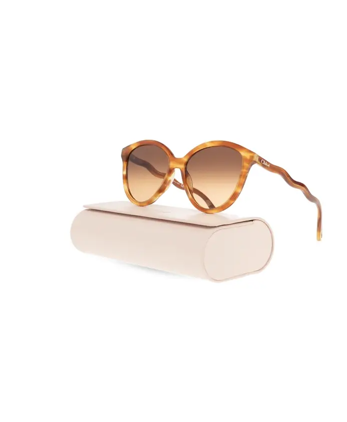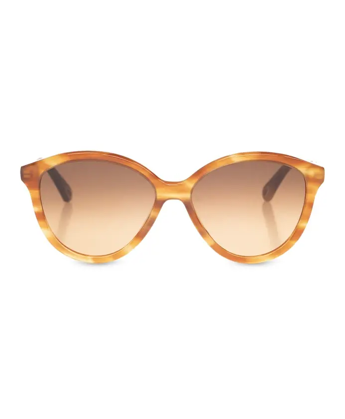 Коричневые солнцезащитные очки «кошачий глаз» от Chloe. Изготовлены из биоацетата с черепаховым покрытием, украшены гравированным золотистым логотипом по бокам, декоративными дужками с каплевидными отверстиями для крепления украшений и коричневыми градиентными линзами со 100% защитой от УФ-излучения. В комплекте футляр.