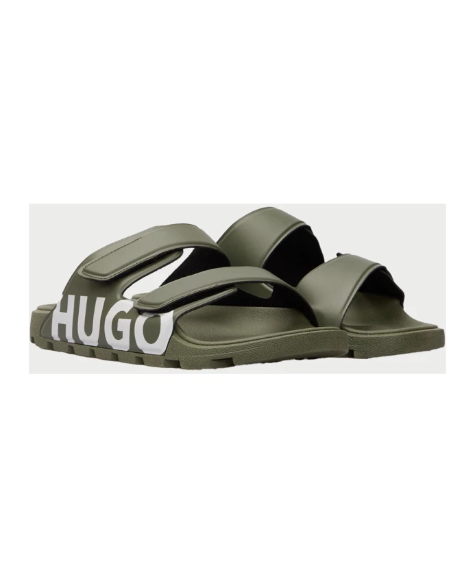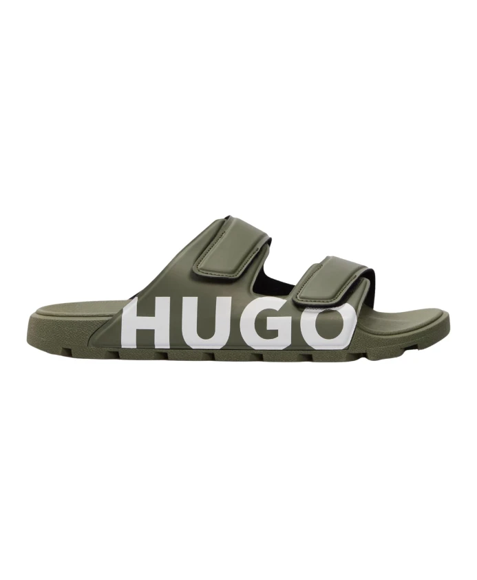 Мужские шлепанцы Hugo Evander с двойными ремешками и застежкой на липучке. Нескользящая подошва. Логотип сбоку. Состав: Верх: 98% поливинилхлорид, 2% полиуретан, Подкладка: 100% полиэстер, Подошва: 70% поливинилхлорид, 30% термопластичный полиуретан, Стелька: 70% поливинилхлорид, 30% термопластичный полиуретан.