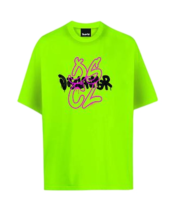 В этом объявлении представлена уникальная мужская футболка с крупным графическим рисунком на передней части, выполненным методом распыления. Рисунок может незначительно отличаться, что делает каждое изделие неповторимым. Для сохранения яркости неоновых цветов и качества печати следуйте инструкциям по стирке.