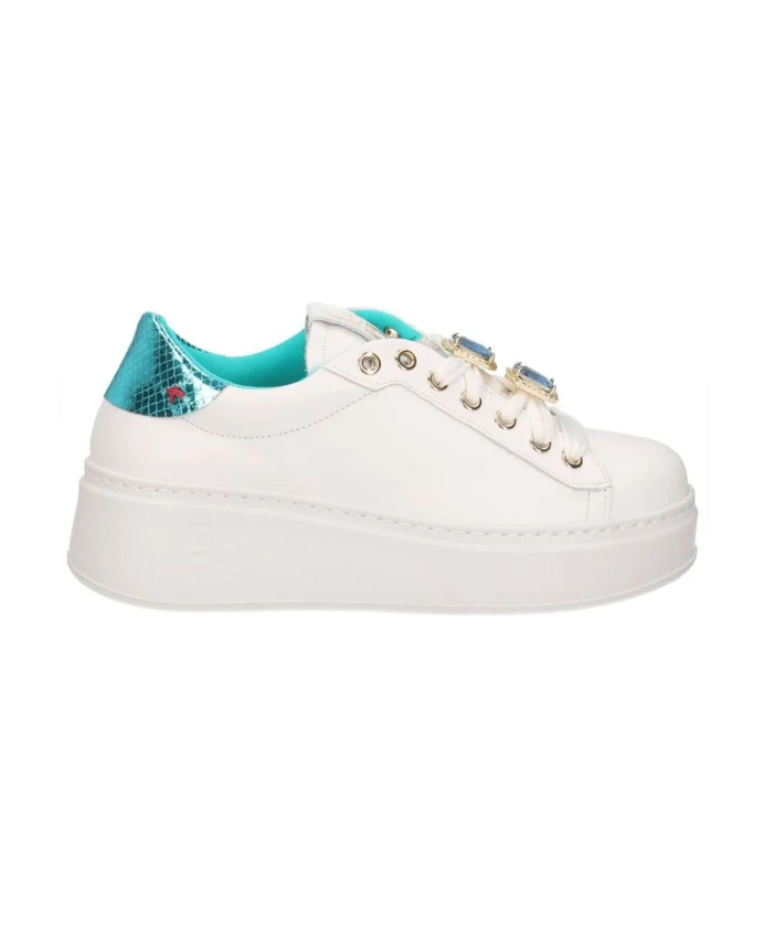 Женские кроссовки Gio+ из белой кожи с бирюзовыми шнурками в форме черепаховой расцветки, на легкой резиновой подошве EVA высотой 5 см для комфортного ношения. Практичная кожаная стелька съемная. Декоративные элементы на обеих ногах. Эти кроссовки добавят гламура вашим повседневным образам. Сделано в Италии.