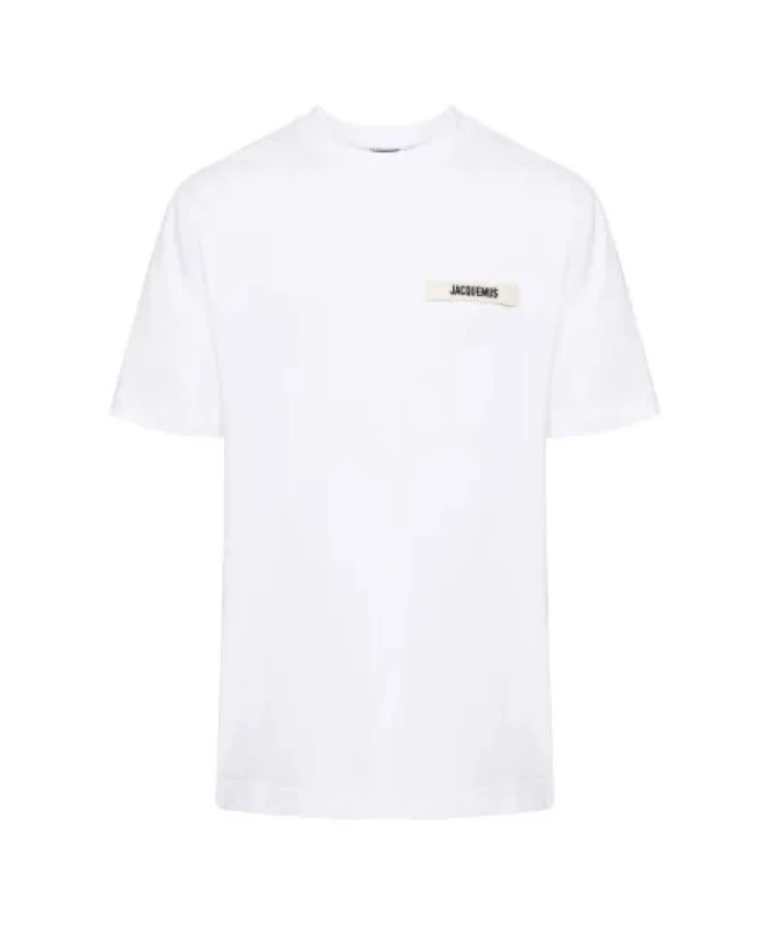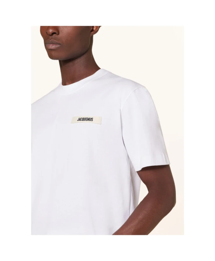 Подчеркните свой повседневный стиль с помощью этой белой футболки с короткими рукавами Jacquemus 'The Gros Grain'. Изготовленная из 100% хлопка, она имеет классический ребристый круглый вырез, прямой низ и вышитую нашивку с логотипом на груди. Свободный крой придает этой вневременной вещи современный вид.