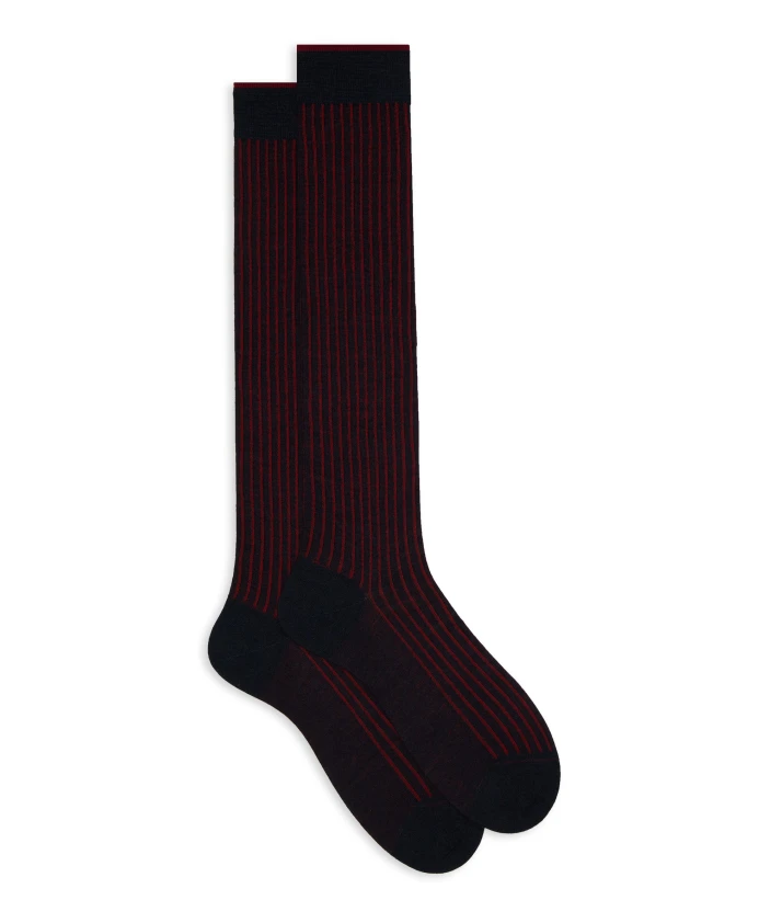 Длинные носки Gallo в сине-меланжевом и ярко-красном цветах - стильный вариант с культовой широкой двойной ребристой вязкой, который добавит изюминку любому образу. Ключевые характеристики: Сине-меланжевый | Ярко-красный | Шерсть | Хлопок | Широкая двойная ребристая вязка | Состав и уход: Шерсть | Хлопок