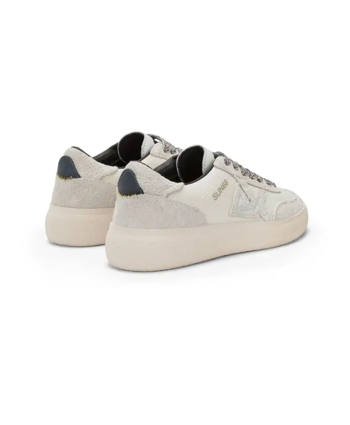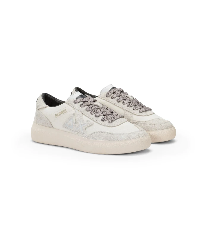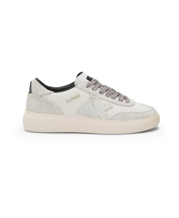 Подчеркните свой стиль с помощью этих элегантных женских кроссовок Sun68. Изготовленные из сочетания замши и белой ткани, они украшены рельефным логотипом сбоку, черно-белым язычком и шнурками с крапчатым рисунком. Съемная стелька и стандартная резиновая подошва обеспечивают комфорт в течение всего дня.