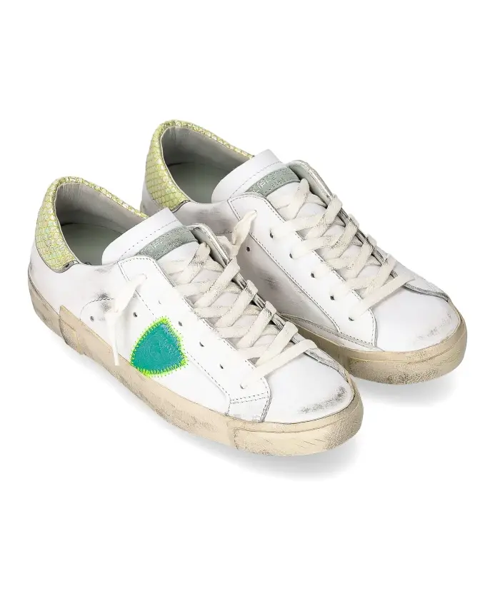 Кроссовки из телячьей кожи с эффектом потертости, украшенные нашивкой с рисунком под кожу рептилии и эмблемой с платиновым эффектом. Они имеют мягкую съемную стельку и дышащую подкладку из вспененного хлопка. Края обработаны вручную с крапчатым узором. Резиновая подошва имеет индивидуальный протектор.