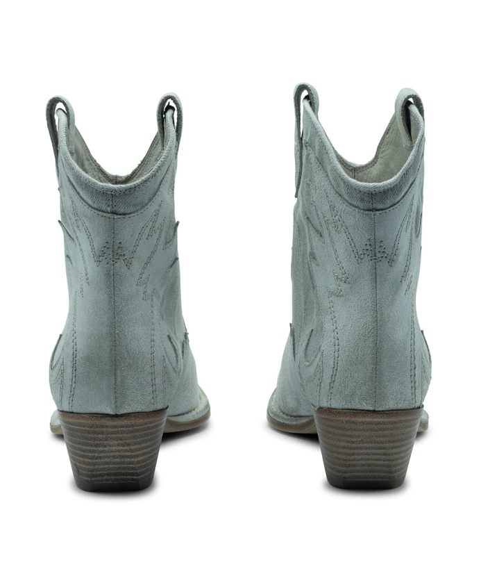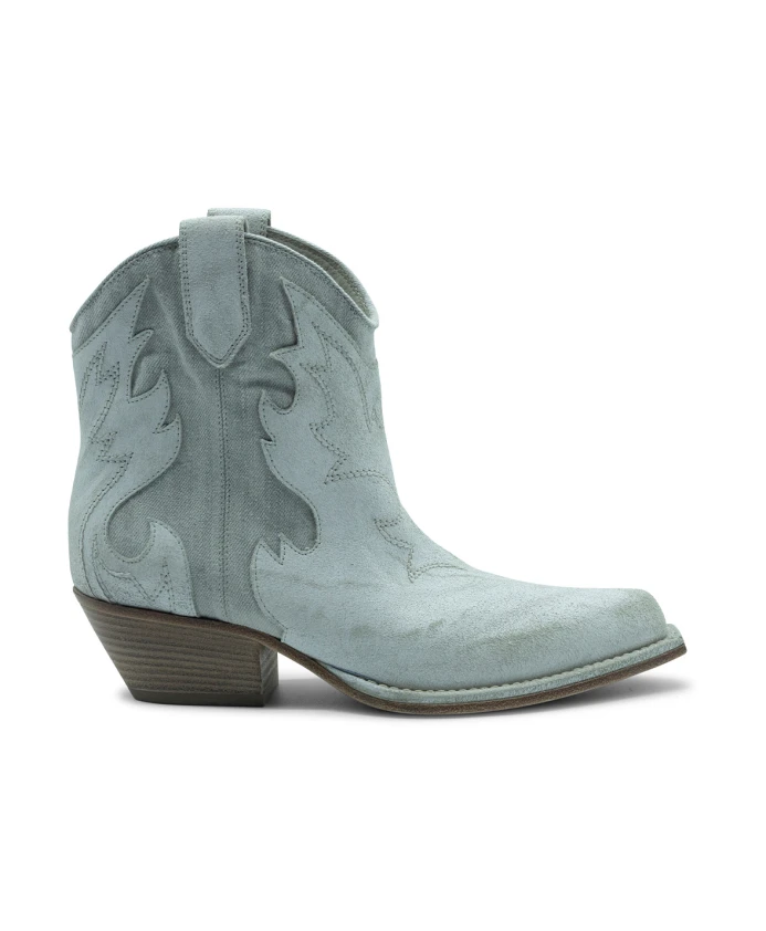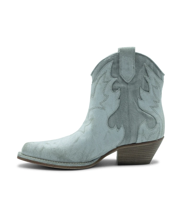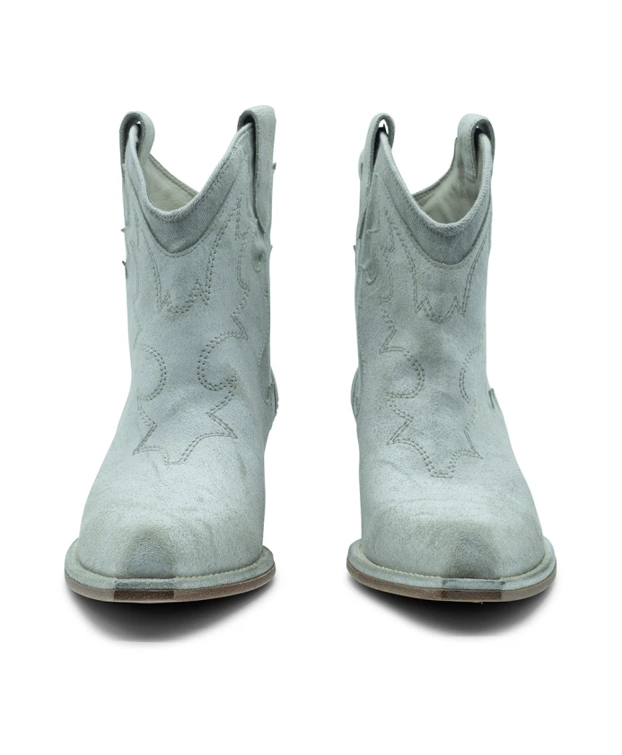 Ботильоны Westy цвета экрю/песочный. Джинсовая ткань с эффектом потертости и винтажный вид; вышитый мотив в стиле вестерн на голенище. Кожаная подошва с джинсовой отделкой. Сделано в Италии. Верх: разрез на икре, джинсовая ткань. Состав подошвы: кожа. Коллекция: весна-лето 2025. Высота каблука: 50 мм.