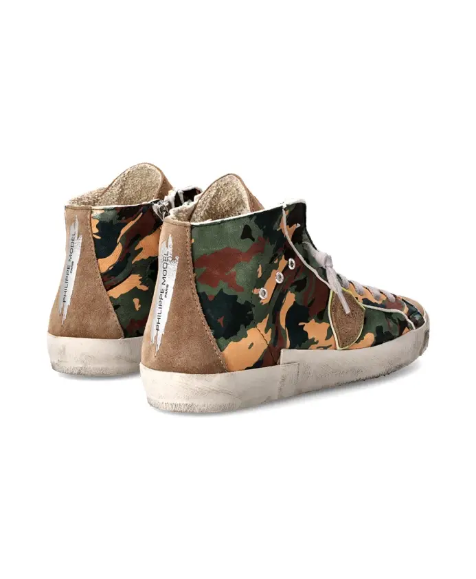 Высокие кроссовки из телячьей кожи с камуфляжным рисунком. Мягкая съемная стелька, дышащая подкладка из вспененного хлопка. Отделка ручной работы с фрезерованными деталями для винтажного эффекта. Резиновая подошва с уникальным рисунком протектора и внутренней застежкой-молнией для комфортной посадки.