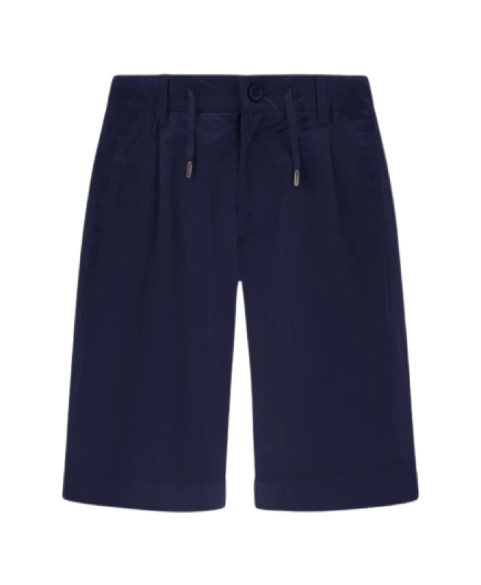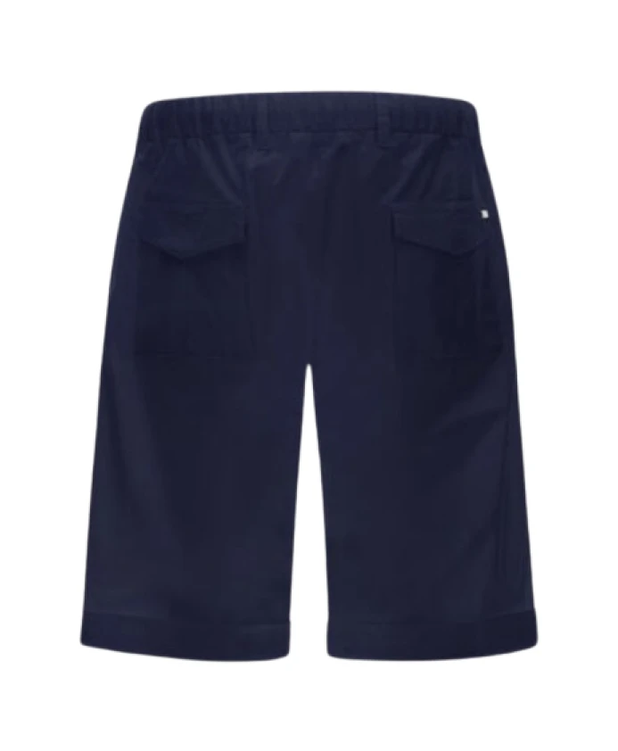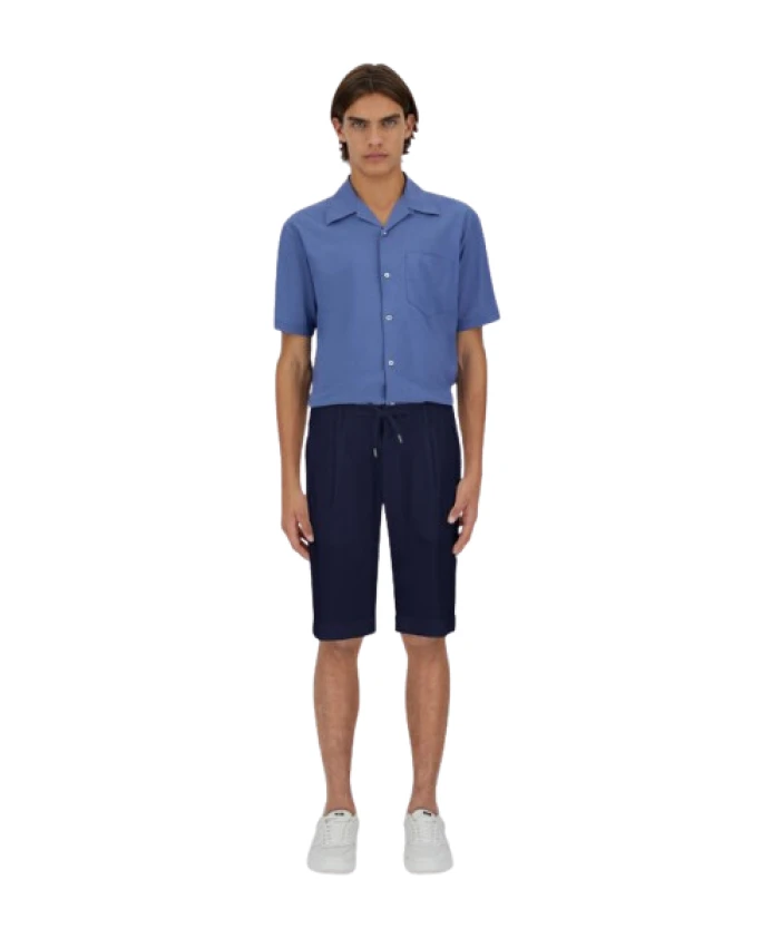 Синие бермуды из эластичного хлопка, водонепроницаемые и обработанные для создания слегка мятой текстуры. Стандартный крой, эластичный пояс на шнурке, складки, боковые карманы, задние накладные карманы, логотип Herno сзади, застежка на пуговицу и потайную молнию. Состав ткани: 96% хлопок, 4% эластан.