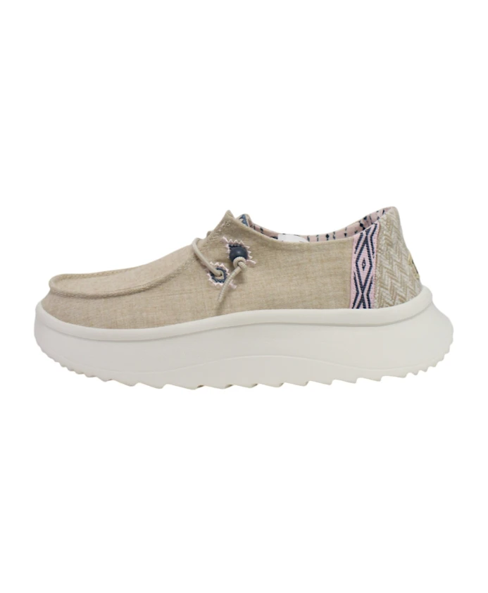 Подчеркните свой стиль с помощью этих женских туфель на шнуровке Hey Dude из искусственной кожи с логотипами спереди и сзади, верхом из ткани и подкладкой из ткани с принтом, съемной стелькой из пеноматериала, сверхлегкой гибкой резиновой подошвой и эластичной шнуровкой по центру. Состав: Ткань.