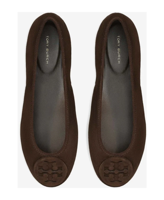 Подчеркните свой стиль с помощью этих балеток Tory Burch. Изготовленные из темно-коричневой замши с металлическим логотипом в виде монеты на передней части, эти балетки имеют эластичные края и резиновую подошву для комфорта. Произведено во Вьетнаме из смеси 95% замши и 5% нейлона. Размер 7.