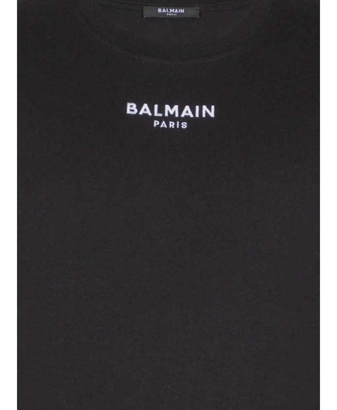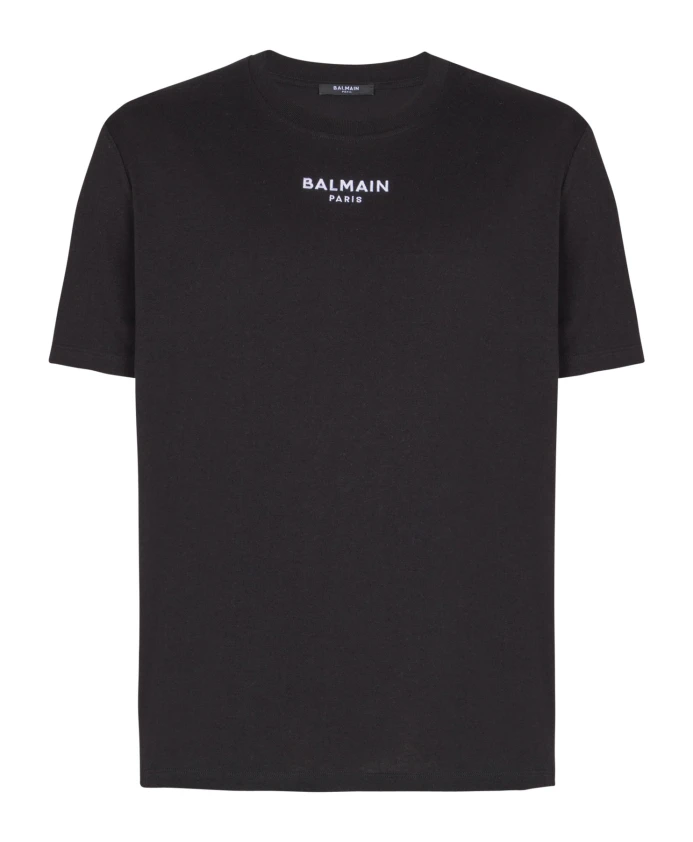 Хлопковая футболка. Круглый вырез. Короткие рукава. Вышивка Balmain Paris под вырезом. Обычный крой. Рост модели 191 см, размер M. Основной материал: 100% хлопок. Сделано в Италии. Артикул: FH0EG000BD18. 100% хлопковых волокон в этом изделии выращены органическим способом и сертифицированы.