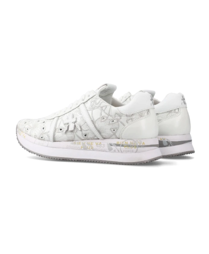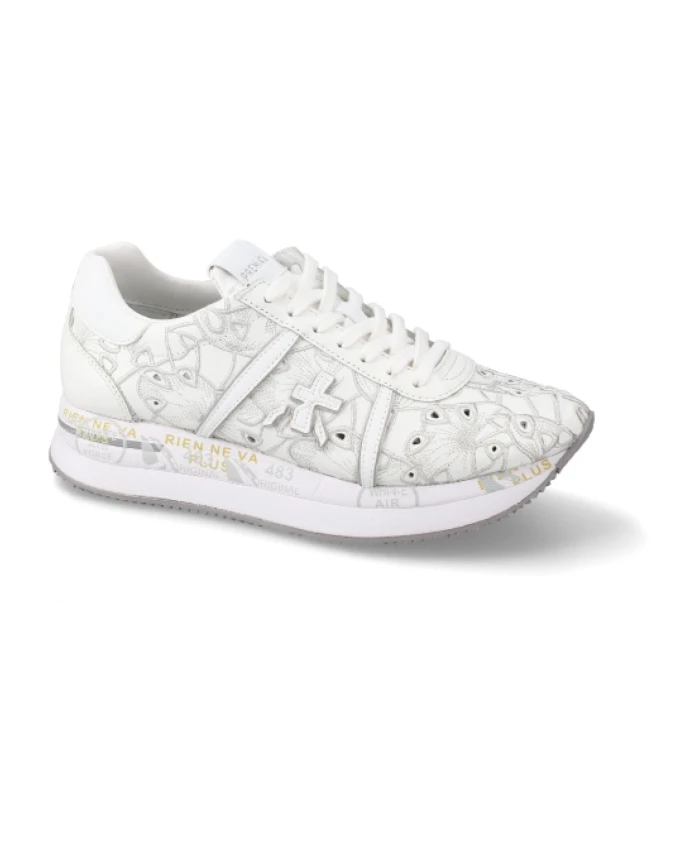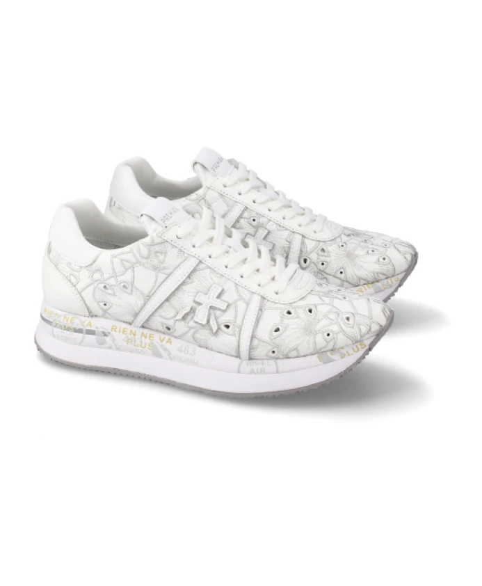 Подчеркните свой повседневный стиль с помощью этих женских кроссовок PREMIATA Conny. Эти кроссовки имеют стандартную посадку, платформу высотой 4,5 см, изготовлены из белой замши и нейлона, оснащены зелеными шнурками и съемной стелькой. Идеально подходят для стильного и комфортного образа.