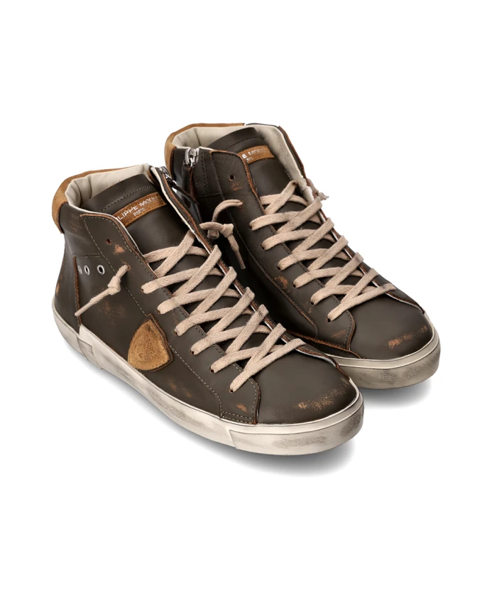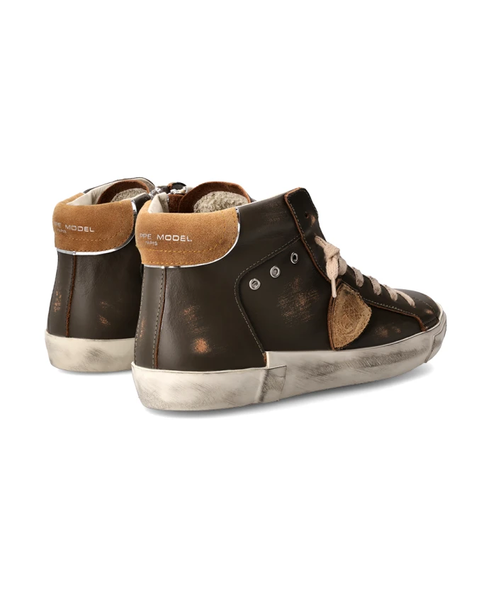 Высокие кроссовки из телячьей кожи с эффектом потертости. Мягкая стелька и дышащая подкладка из вспененного хлопка. Ручная отделка с фрезерованными деталями для создания винтажного эффекта. Резиновая подошва с уникальным рисунком протектора и внутренней молнией для комфортной посадки.