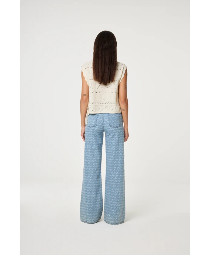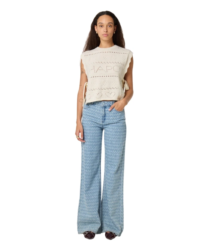 Эти светло-голубые джинсы с широкими штанинами впечатляют нежным принтом в виде белых полукругов по всей поверхности. Изготовленные из 100% органического хлопка, они сочетают в себе комфорт и особый стиль, поэтому идеально подходят для того, чтобы заявить о себе в повседневной жизни.