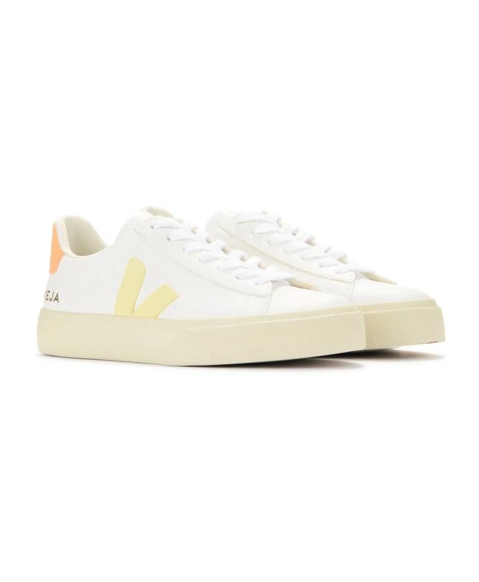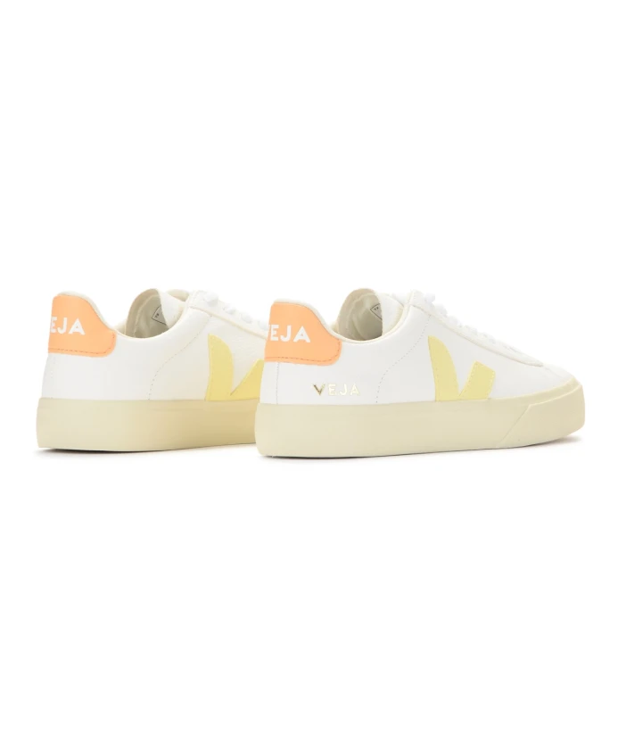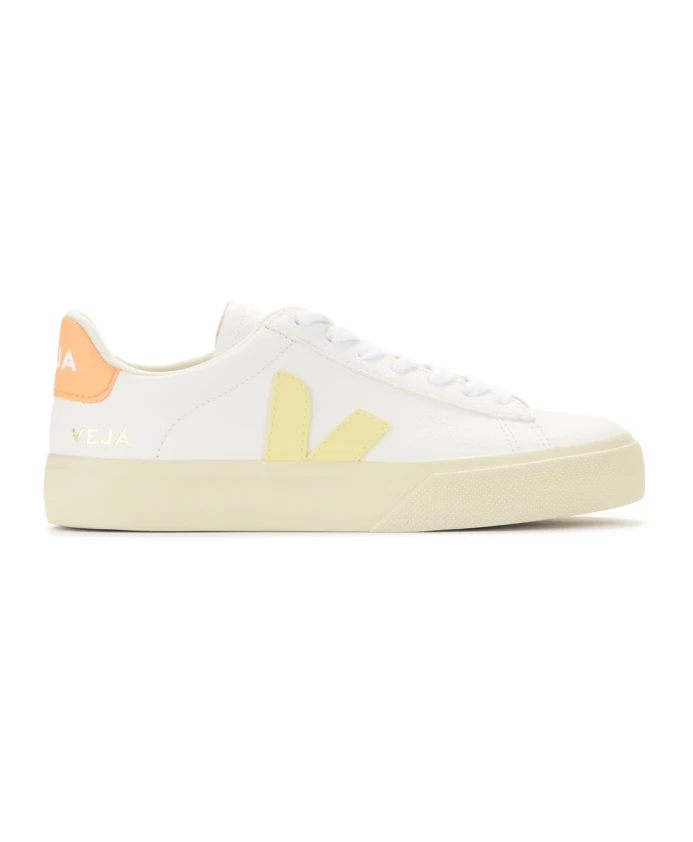 Кроссовки Veja Campo Chromefree из белой кожи с желтым резиновым логотипом. Подошва из персиковой кожи. Подкладка из органического хлопка. Стелька из натурального каучука и других синтетических материалов. Подошва из замши и резины. Маломерят, рекомендуем заказывать на размер больше.
