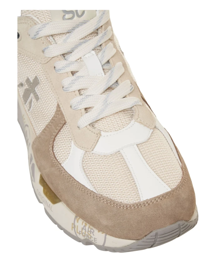 Откройте для себя кроссовки PREMIATA 'Mase' бежевого цвета с закругленным носком, однотонными шнурками и контрастными сетчатыми деталями. Они имеют съемную стельку и приподнятую подошву для дополнительного комфорта и стиля. Изготовлены из кожи, текстиля и подошвы из ЭВА. Не стирать.