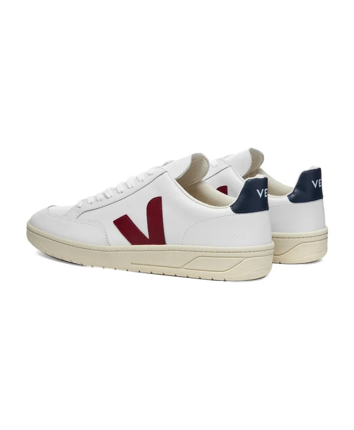 Подчеркните свой стиль с помощью этих белых низких женских кроссовок Veja 'V-12'. Изготовленные из кожи, они имеют контрастную темно-синюю пятку с белой надписью логотипа, красный логотип V цвета марсала сбоку, резиновую подошву, шнуровку на хлопковых шнурках и закругленный носок.