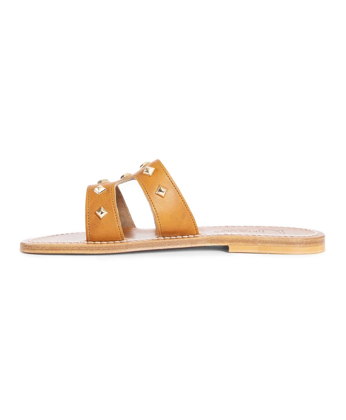 Подчеркните свой летний стиль с помощью этих шлепанцев K.JACQUES. Изготовленные из гладкой кожи элегантного оттенка Mel, они имеют передний ремешок, украшенный декоративными золотистыми заклепками. Дополнены кожаной подошвой для комфорта и стиля. Изготовлены из 100% коровьей кожи.