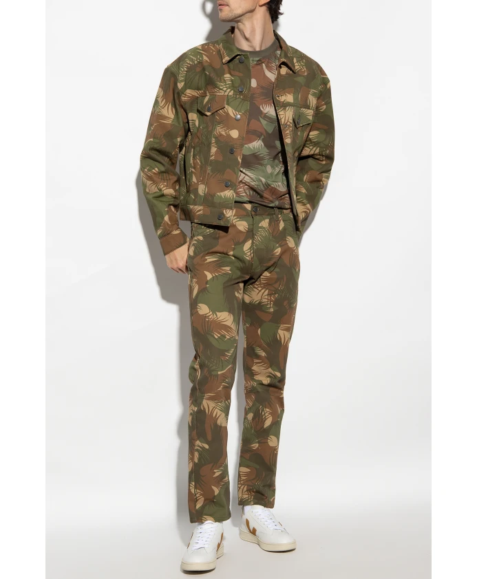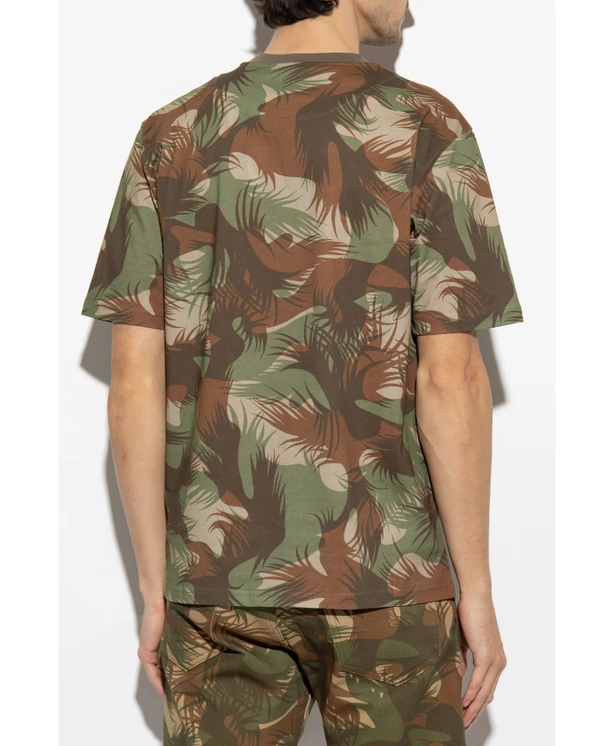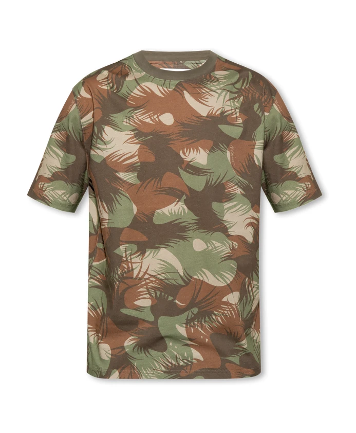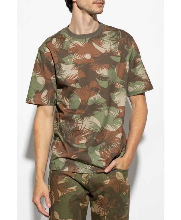 Футболка с круглым вырезом от Moschino, выполненная из хлопка, в зеленом, коричневом и бежевом цветах. Модель с короткими рукавами украшена принтом.