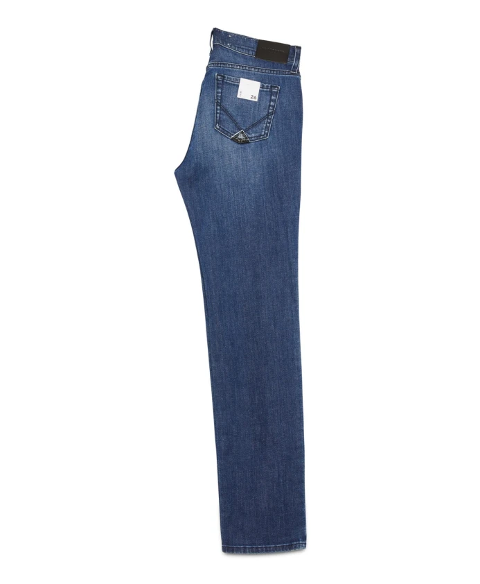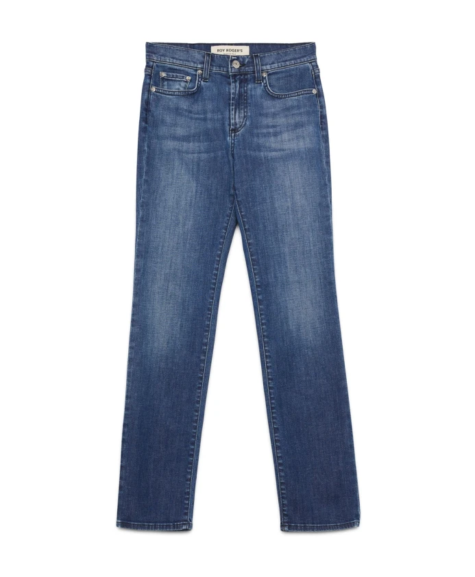 Женские джинсы прямого кроя Roy Roger's зауженного силуэта, темно-синего цвета. Средняя посадка, петли для ремня и нашивка с логотипом бренда сзади. Застежка на пуговицу и молнию, два передних кармана и два задних кармана с этикеткой Roy Roger's. Состав: 98% хлопок и 2% эластан.