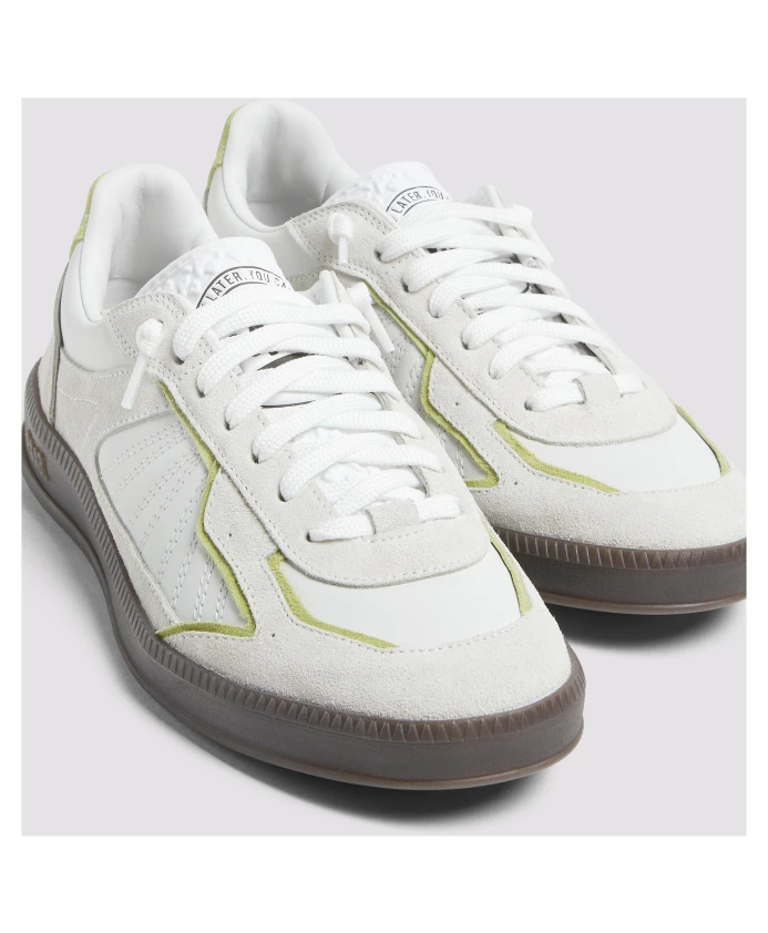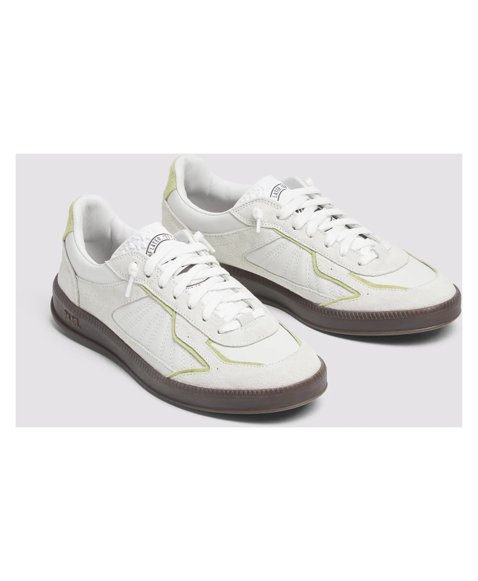 Подчеркните свой стиль с помощью кроссовок Marte White/Green от P448. Эта стильная пара выполнена из белой кожи, дополненной замшевыми вставками оливково-зеленого цвета на пятке и краях, имеет белый кожаный язычок с узором, белые шнурки и фирменную темно-коричневую подошву P448.