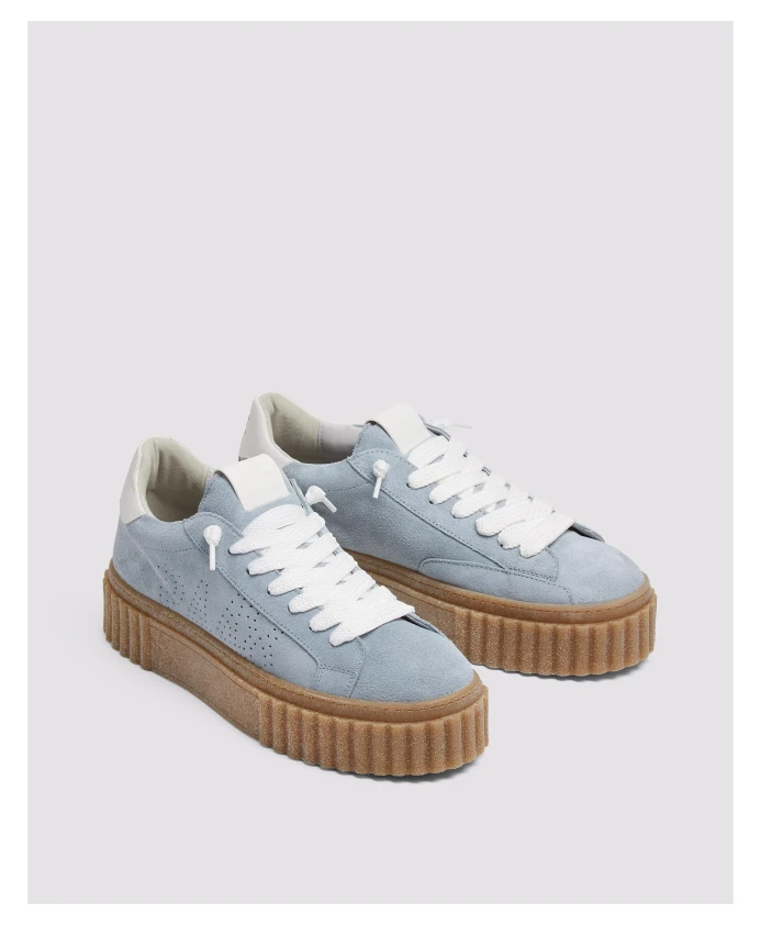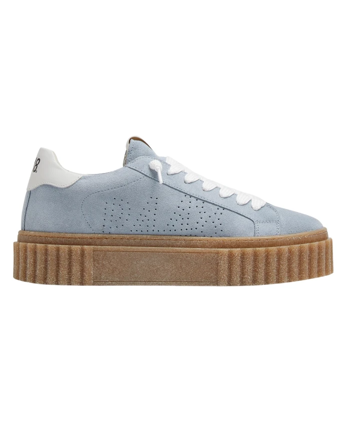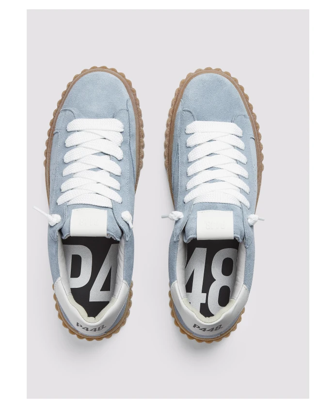 Поднимите свой стиль на новый уровень с кроссовками P448 Creeper Storm. Эти эффектные кроссовки, выполненные из светло-голубой замши с белой кожаной вставкой на пятке и белыми шнурками, отличаются фирменной янтарной резиновой подошвой P448 и смелым дизайном платформы из крепа.