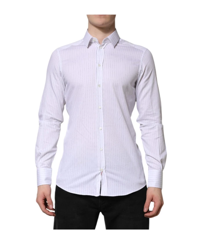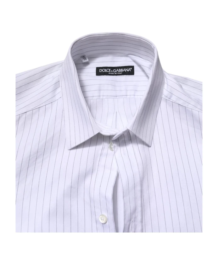 Обновите свой гардероб с помощью этой 100% оригинальной рубашки Dolce & Gabbana. Изготовленная в Италии из 100% хлопка, эта белая рубашка в полоску имеет классический воротник, длинные рукава и приталенный крой для комфорта и стиля. Детали с логотипом добавляют нотку роскоши.