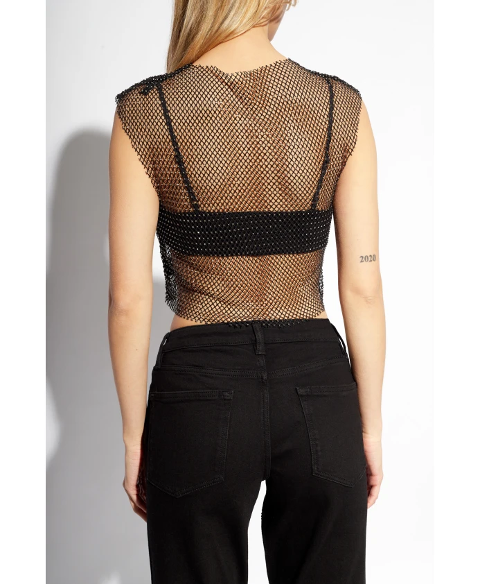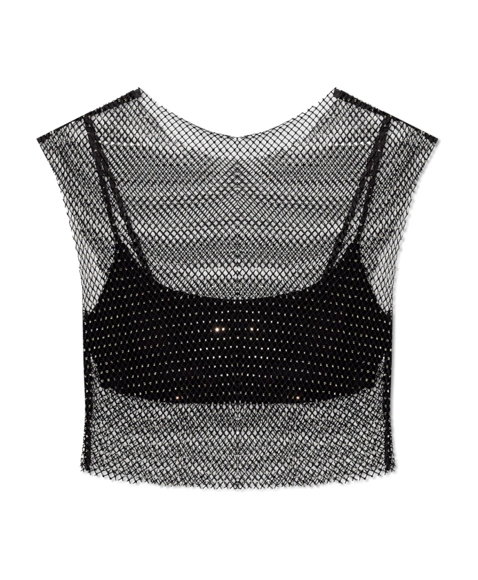 Черный двухслойный укороченный топ «Calytrix» от AllSaints. Модель состоит из блестящего сетчатого внешнего слоя и съемного внутреннего слоя в виде майки. Параметры модели: рост: 176 см, обхват груди: 85 см, обхват талии: 60 см, обхват бедер: 89 см. Модель носит размер: 8.