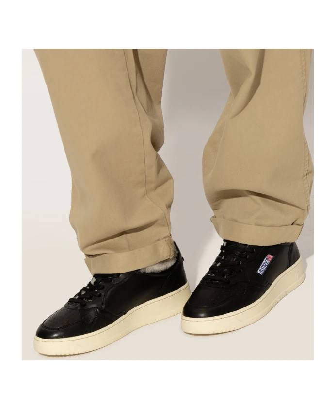 Черные кроссовки «Aulw» от Autry. Изготовлены из кожи и отделаны кремовым искусственным мехом. Модель на шнуровке, кремовой резиновой подошве, украшена логотипом бренда и декоративной перфорацией спереди. Высота подошвы: 3 см. Высота подошвы в самой высокой точке: 4 см.