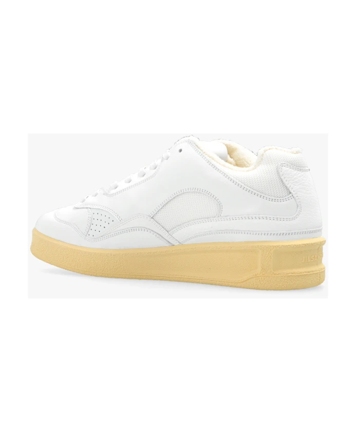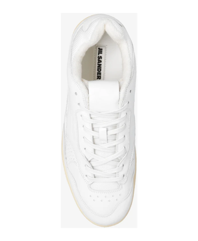 Подчеркните свой повседневный стиль с помощью этих белых низких кроссовок Jil Sander. Изготовленные из смеси кожи и сетчатой ткани, эти кроссовки имеют подкладку из хлопка с эффектом полотенца, круглый носок, шнуровку, резиновую подошву и перфорацию на носке и по бокам.