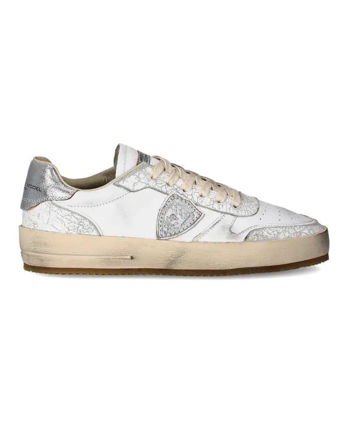 Кроссовки из телячьей кожи с перфорацией на носке и эффектом потрескавшейся кожи для создания потертого вида. Серебристый спойлер, сочетающийся с эмблемой. Стелька из полиуретановой пены с кожаной подкладкой. Подкладка из вспененного хлопка и подошва, прошитая вручную.