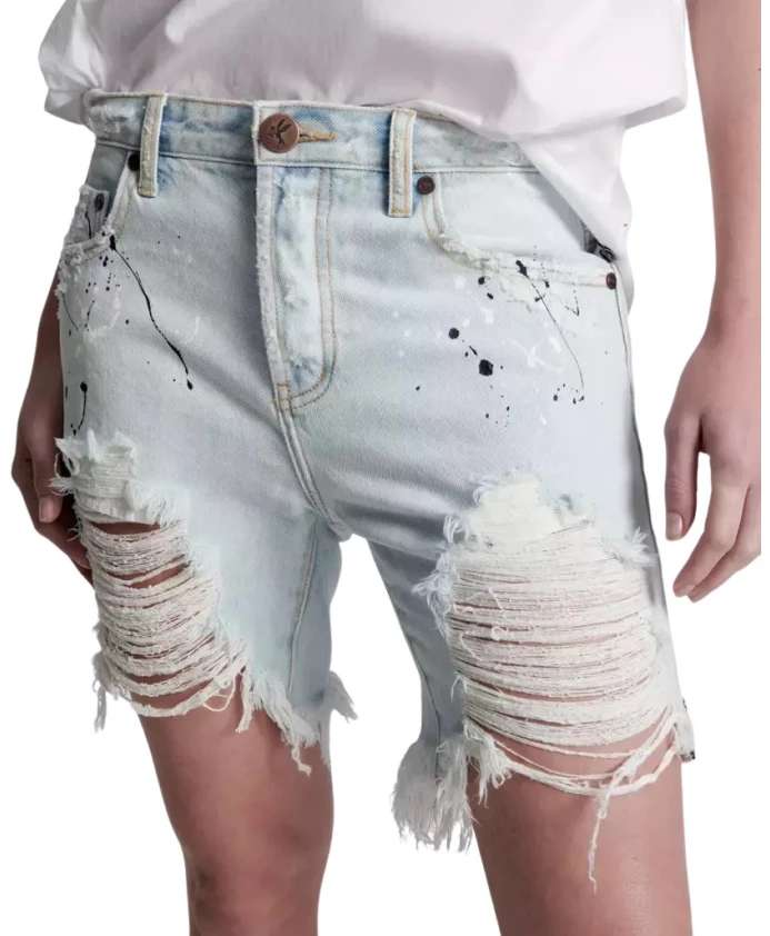 Джинсовые шорты OneTeaspoon Stevies светло-голубого цвета с брызгами краски. Низкая посадка, асимметричные рваные края, пять задних карманов, нашивка с логотипом OneTeaspoon, застежка на молнию и пуговицу, петли для ремня. Состав: 80% хлопок, 20% переработанный хлопок.