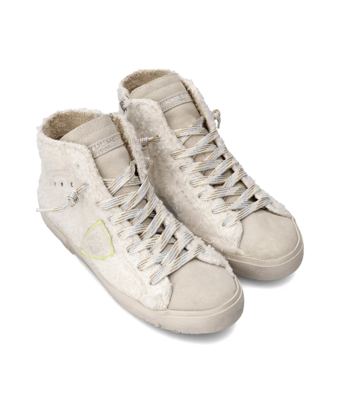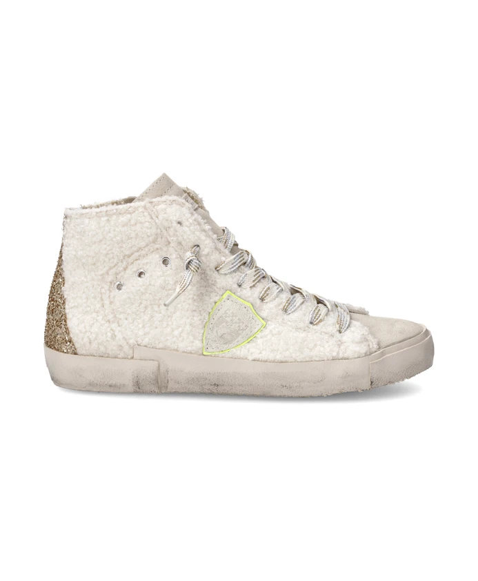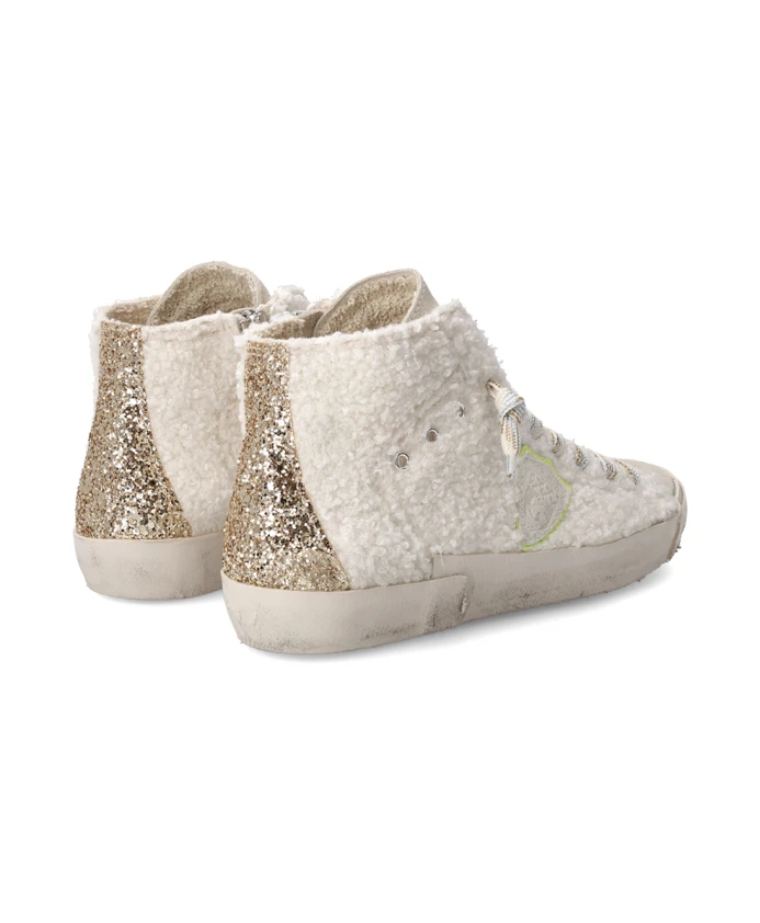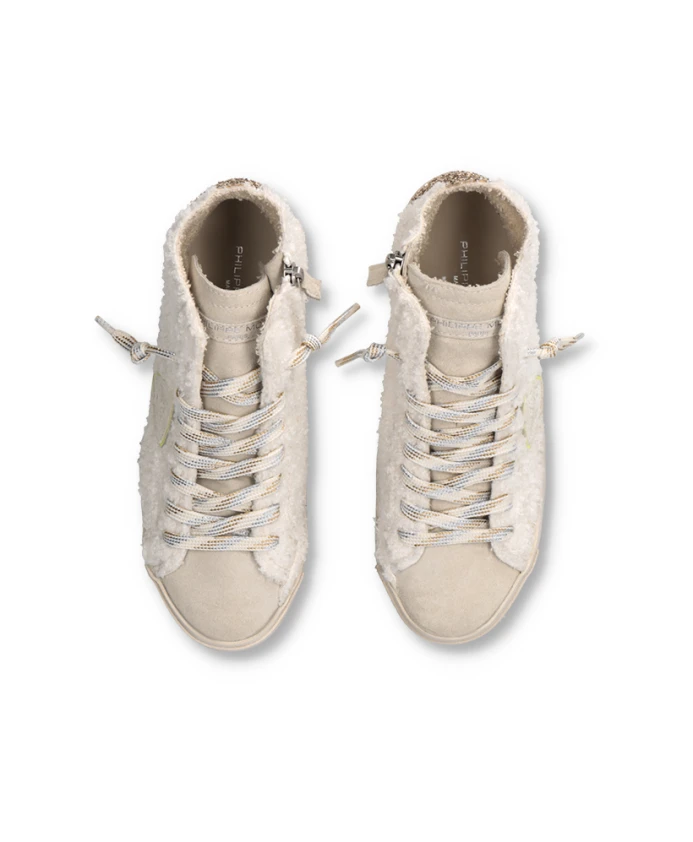 Высокие кроссовки с замшевым верхом, блестками и имитацией овечьей шкуры. Мягкая хлопковая подкладка, съемная стелька с амортизацией, резиновая подошва с ручной прошивкой и потертостями для создания эффекта состаренной обуви. Внутренняя молния для комфортной посадки.