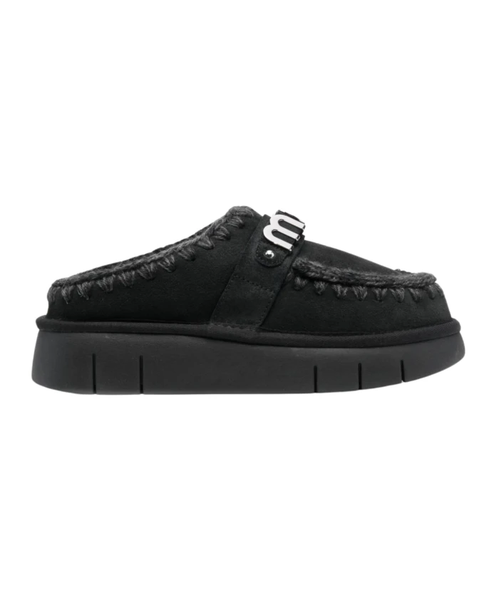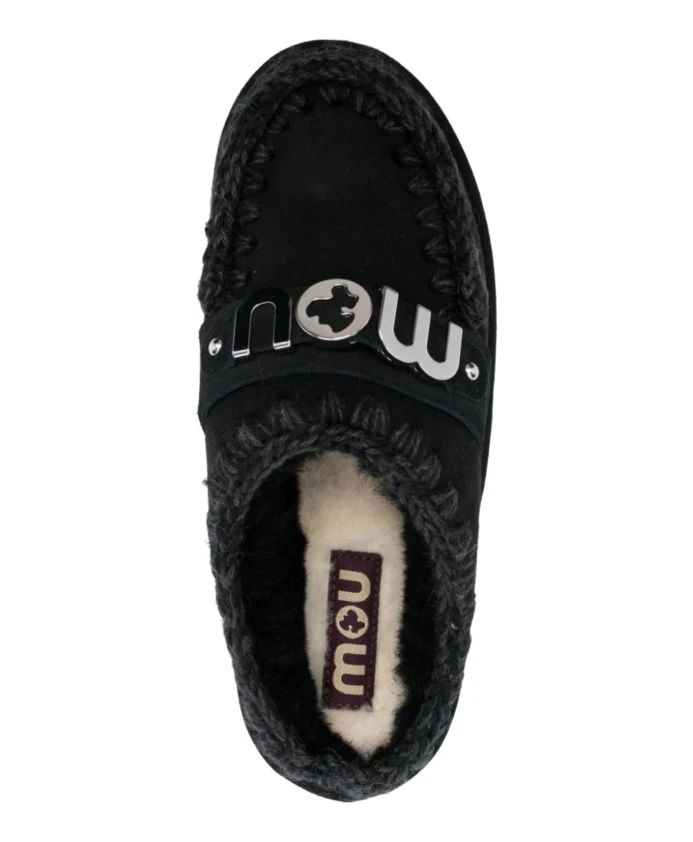 Женственные черные тапочки из овчины от Mou, без застежек, с волнистым краем, серебряной логотипной пластиной, круглым носком, кожаной подошвой с логотипом и платформенной подошвой. Материал верха: 100% овчина, подошва: 100% резина, подкладка: 100% овечья кожа.