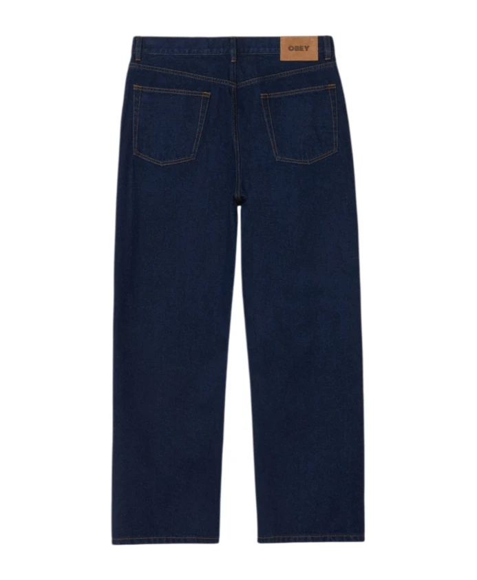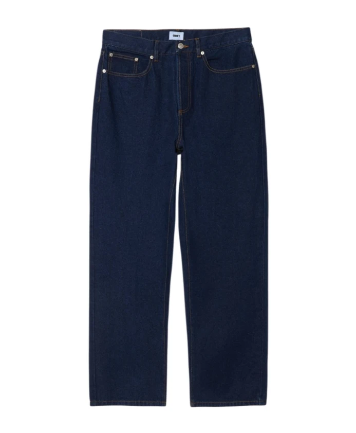 Мужские прямые джинсы Obey из новой коллекции осень/зима 2025. Модель с застежкой на пуговицах, пятью карманами и кожаной этикеткой на поясе сзади. Изготовлены из 100% хлопка, плотность ткани 390 г. Свободный крой, ширина штанины внизу 47 см, зауженные штанины.