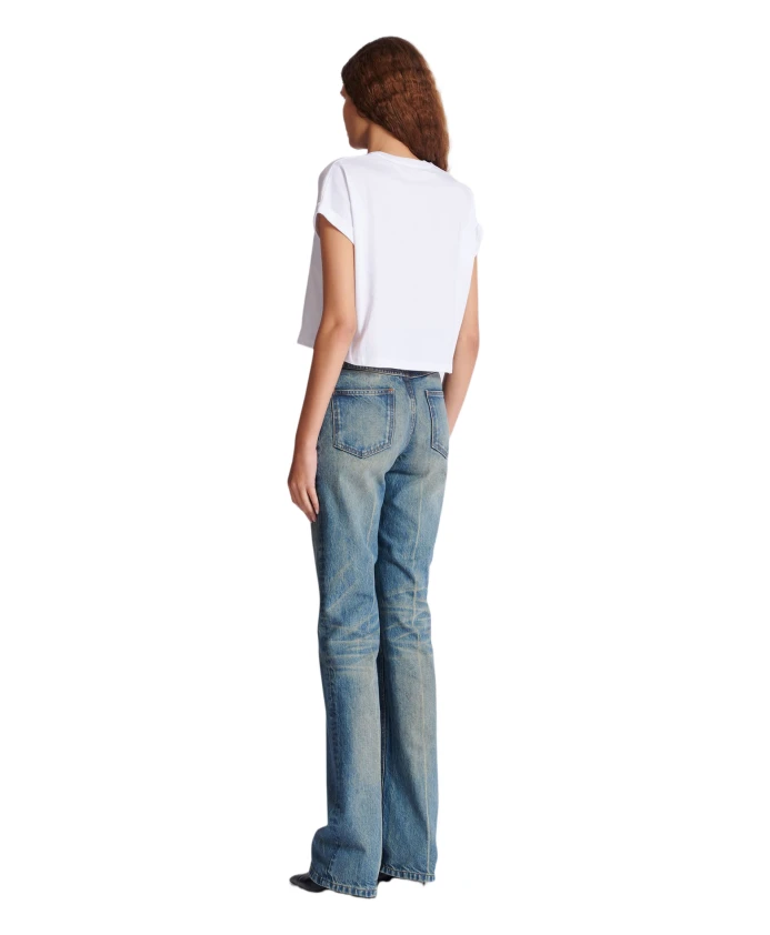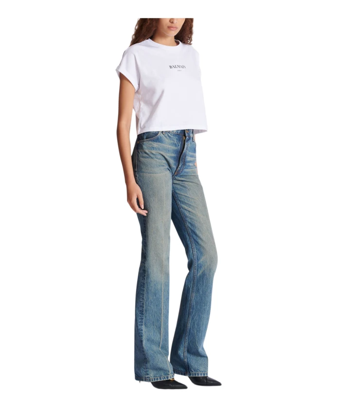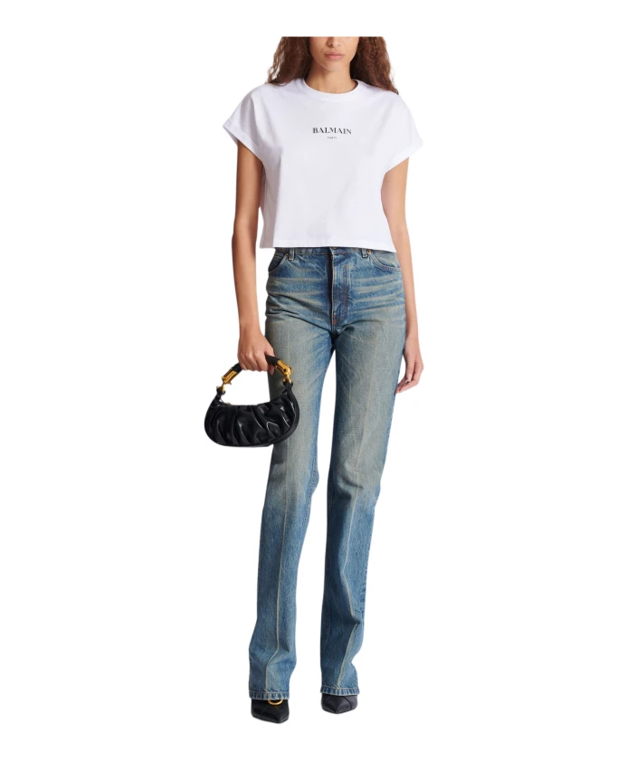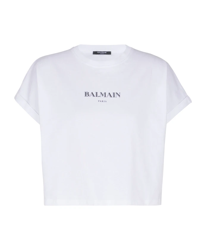 Короткая футболка с принтом Balmain. Укороченный, свободный крой. Круглый вырез с ребристой отделкой. Короткие рукава. Логотип Balmain на передней части. Рост модели 178 см, размер S. Основной материал: 100% хлопок. Сделано в Португалии. Артикул: FF2EE005BD36