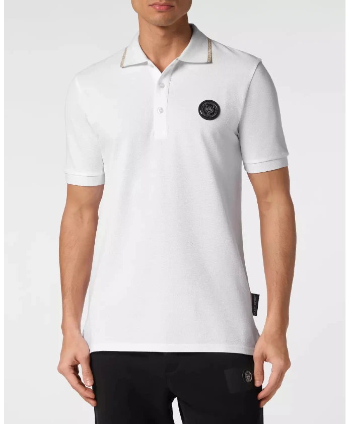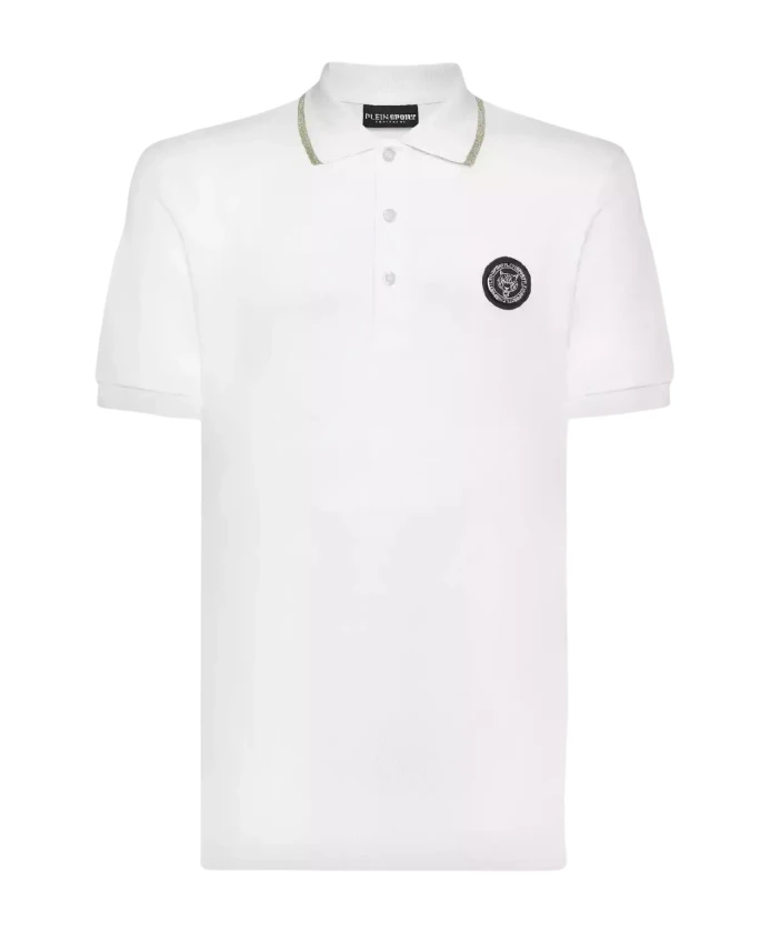 Поло Plein Sport SS Tiger белого цвета, с эластичным заостренным воротником с золотой отделкой, застежкой на три пуговицы, эмблемой бренда на груди и культовым золотым принтом в виде головы тигра на спине. Выберите свою любимую рубашку поло Plein Sport.