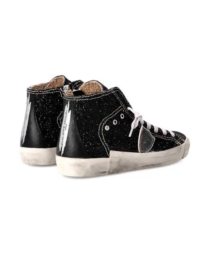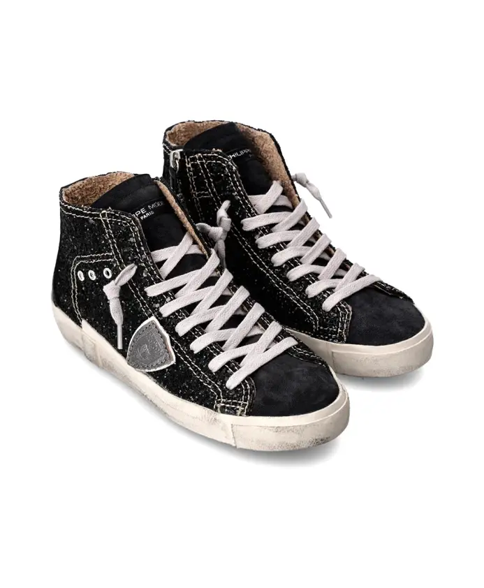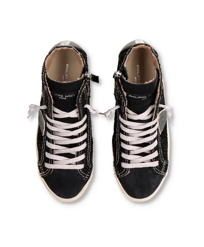 Высокие кроссовки с замшевым верхом и блестящими деталями. Мягкая хлопковая подкладка, съемная стелька с амортизацией, резиновая подошва с ручной прошивкой и потертостями для создания эффекта состаренной обуви. Внутренняя молния для комфортной посадки.