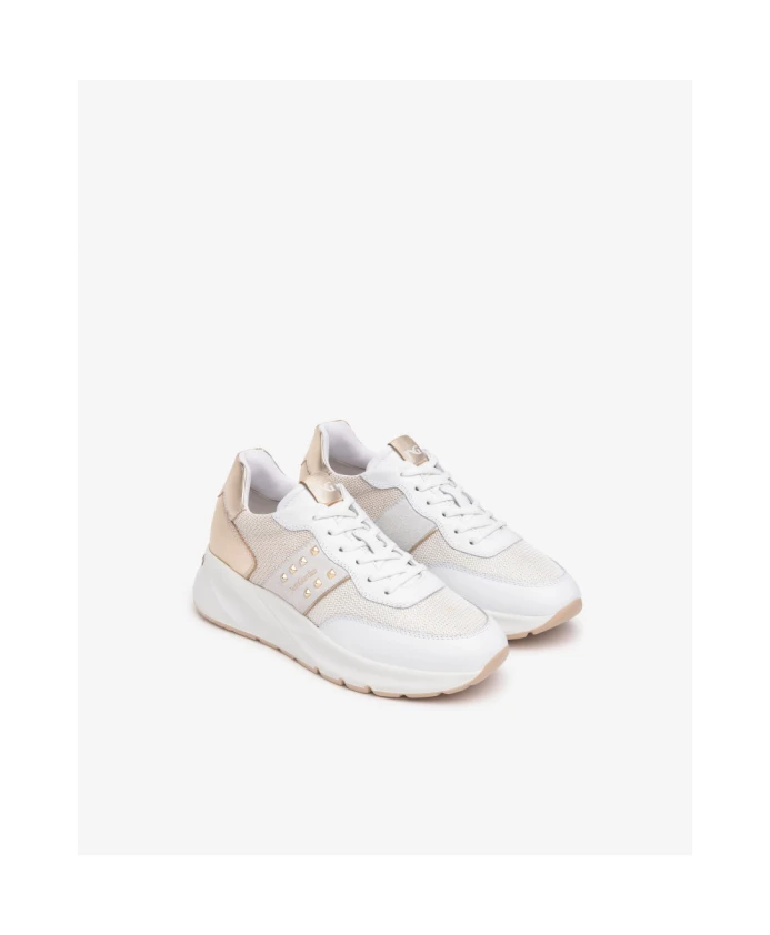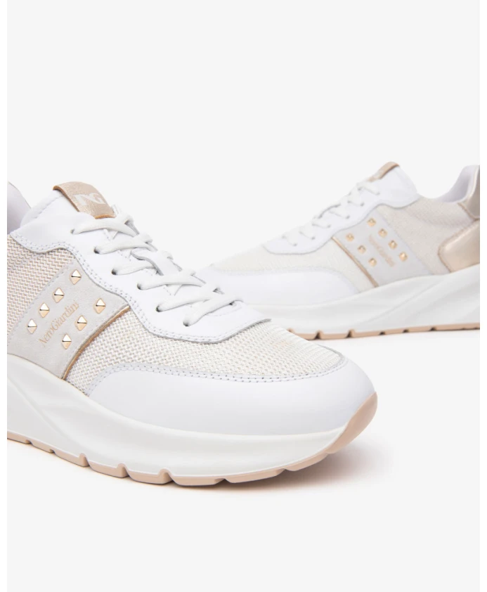 Подчеркните свой стиль с помощью этих женских кроссовок Nerogiardini из кожи и высокотехнологичного материала. Модель украшена золотыми заклепками, имеет шнуровку, кожаную подкладку, съемную стельку и резиновую подошву высотой 4,5 см. Сделано в Италии.