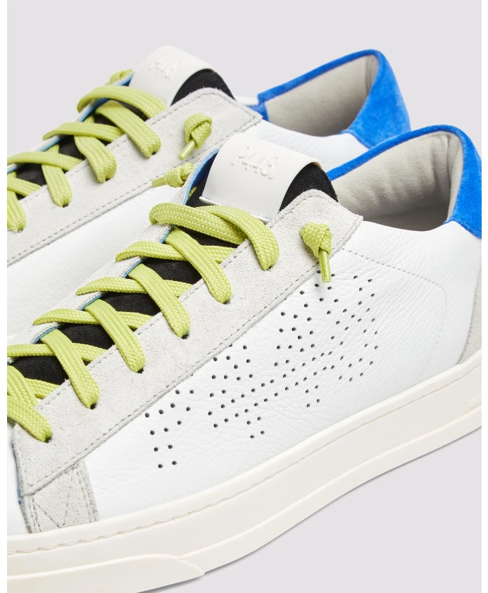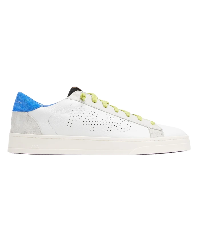 Поднимите свой стиль на новый уровень с кроссовками P448 Jack Neon Blue. Они выполнены из белой кожи и замши, с черным замшевым язычком и замшевой пяткой королевского синего цвета. Завершают образ зеленые шнурки и культовая резиновая подошва P448.