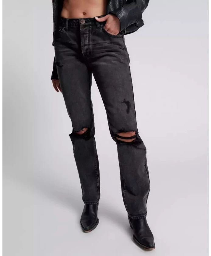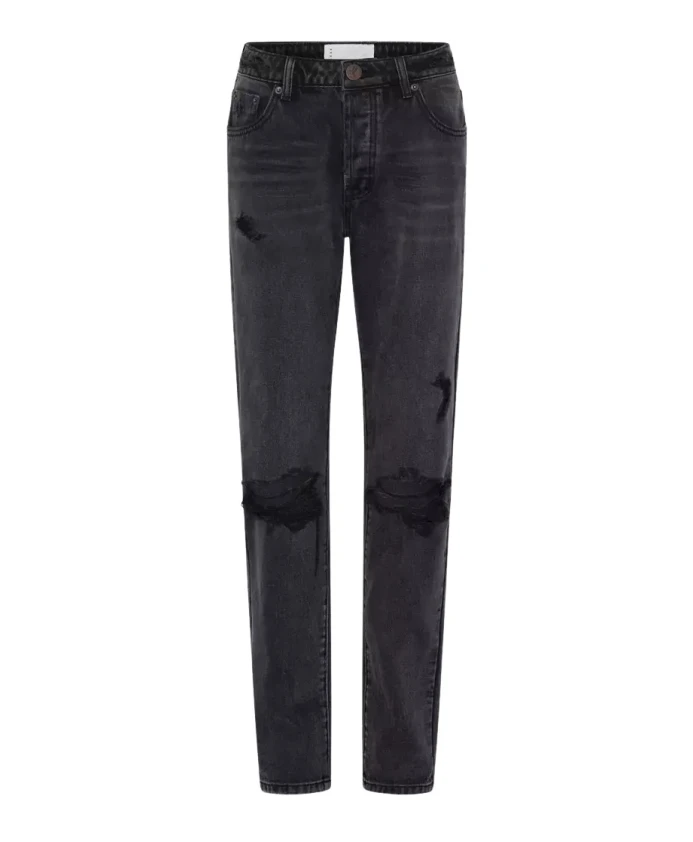 Черные джинсы-тракеры от One Teaspoon, изготовленные из денима со средней посадкой, застежкой на пуговицы, потертостями по всей поверхности, прорезями, вырезанными вручную, и прямыми штанинами. Состав ткани: 80% хлопок, 20% переработанный хлопок.