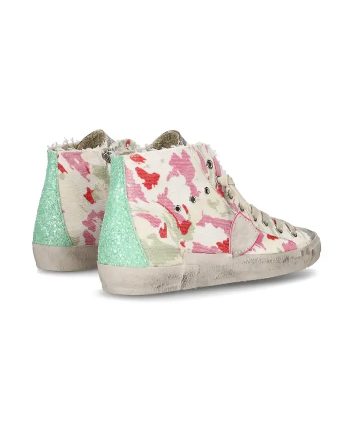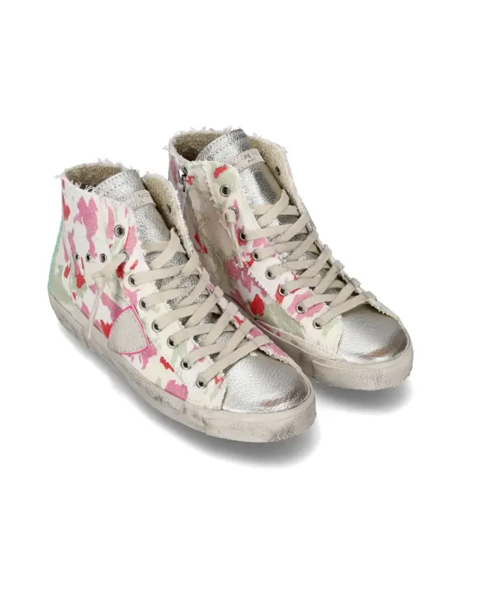Верхняя часть ботинок выполнена из парусины с камуфляжным принтом и украшена вставками из зеркальной ткани, замши и телячьей кожи. Рант изготовлен из резины, а подкладка - из кожи и хлопчатобумажной махровой ткани. Высота подошвы - 2,5 см.