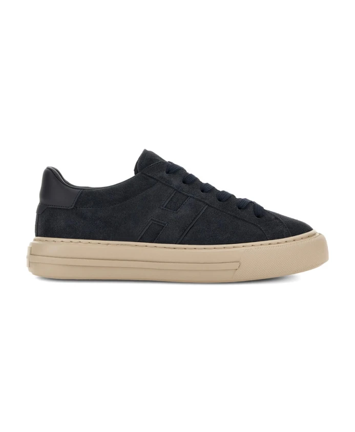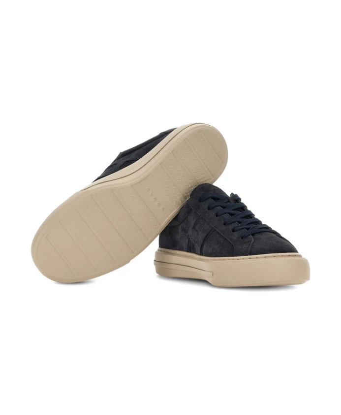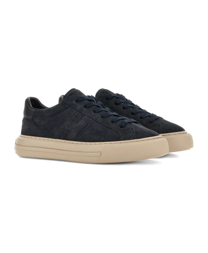 Мужские кроссовки Hogan темно-синего цвета с застежкой на шнуровке спереди, контрастной резиновой подошвой, аппликацией логотипа и фирменной стелькой. Обувь Hogan обычно большемерит; рекомендуется заказывать на один размер меньше.