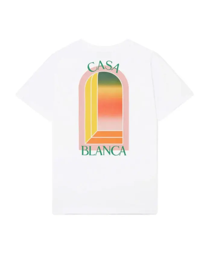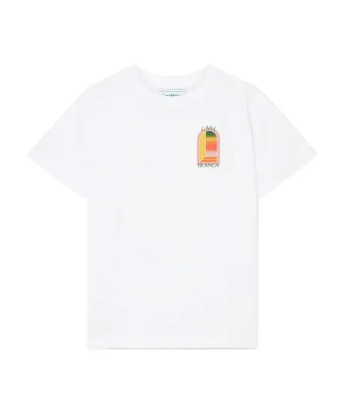 Подчеркните свой повседневный стиль с помощью этой белой мужской футболки с короткими рукавами Casablanca 'Gradient L'Arche'. Эта хлопковая футболка с принтом на груди и спине имеет классический круглый вырез и свободный крой.