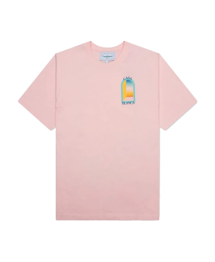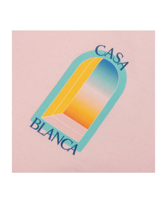 Подчеркните свой повседневный стиль с помощью этой розовой мужской футболки с короткими рукавами Casablanca 'L'Arc Colorè'. Эта хлопковая футболка с принтом на груди и спине имеет классический круглый вырез и свободный крой.