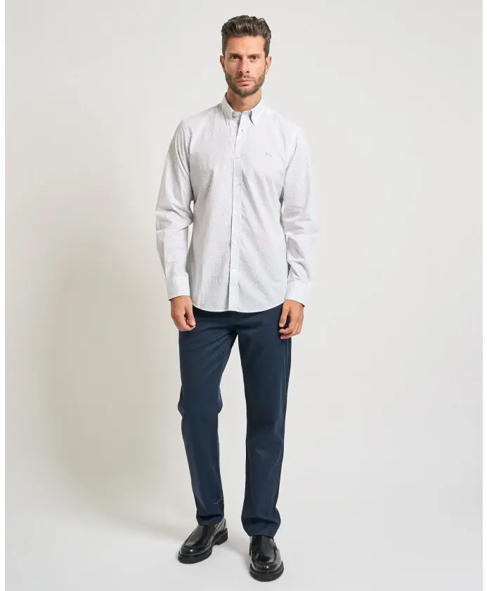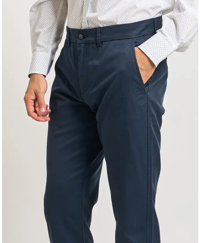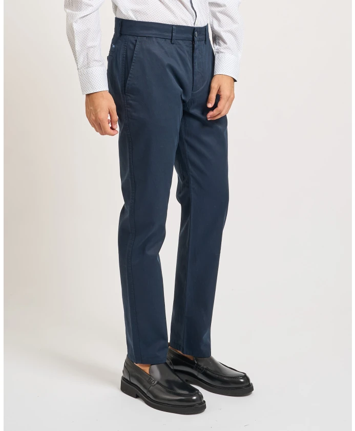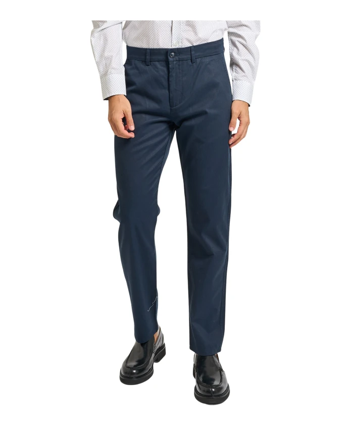 Мужские чиносы Harmont & Blaine из окрашенного хлопка и лиоцеллового габардина. Застежка на пуговицу и молнию, отглаженные складки, французские и задние прорезные карманы. Зауженный крой. Модель носит размер 50, рост 1,85 м.