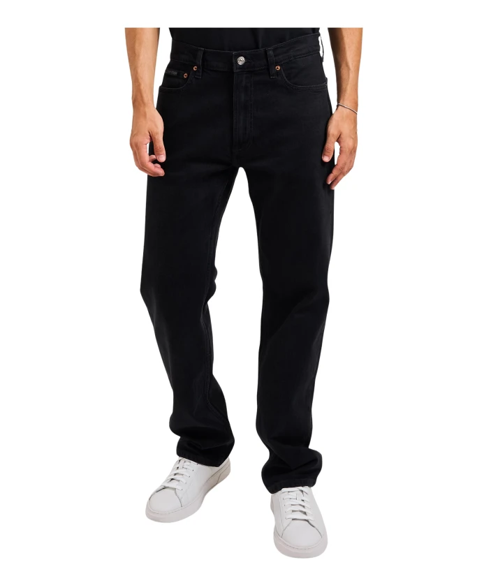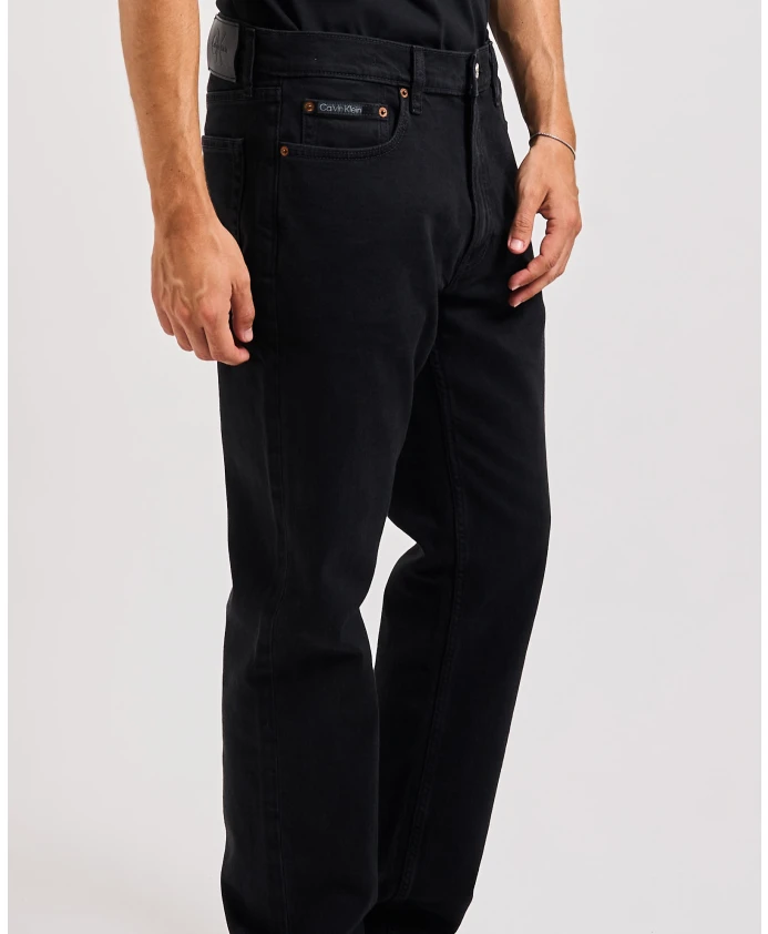 Черные мужские джинсы Calvin Klein. Эластичный хлопковый деним с очень мягкой текстурой, с этикеткой Calvin Klein в стиле 80-х на кармане, застежкой-молнией, логотипом CK, металлическими заклепками и монограммой на спине.