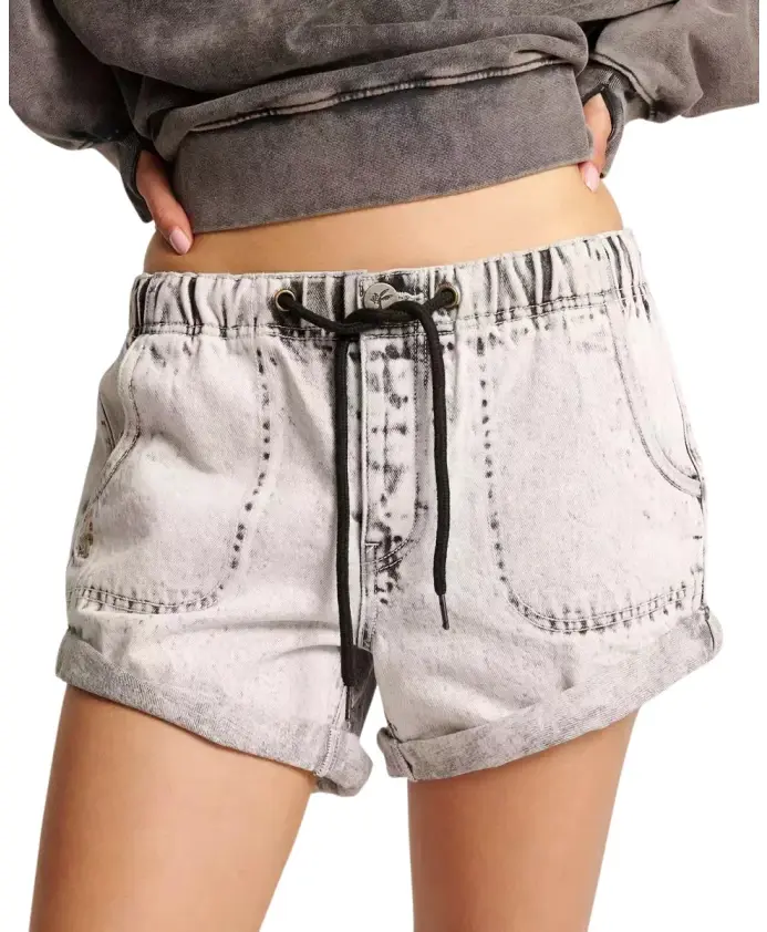 Джинсовые шорты One Teaspoon для женщин, светло-серые, свободного кроя, со средней посадкой на талии, эластичным поясом на шнурке, подвернутыми манжетами сзади, нашивкой с логотипом OTS, изготовлены из мягкого хлопка.