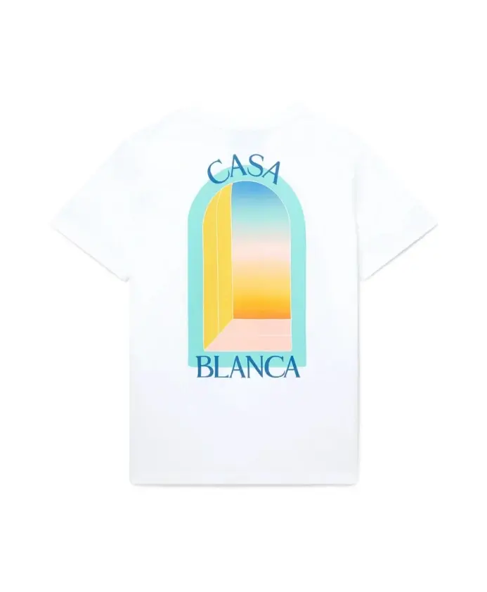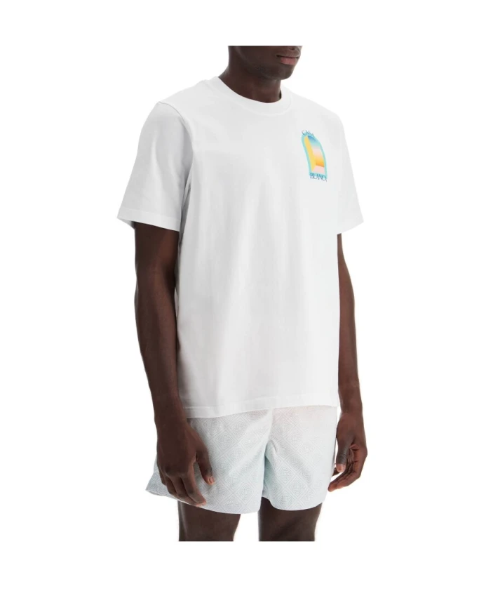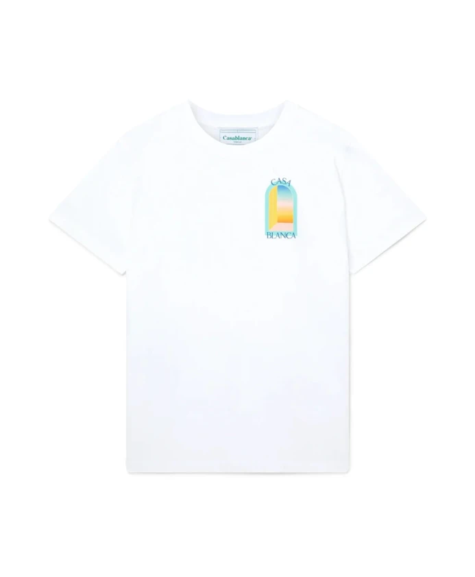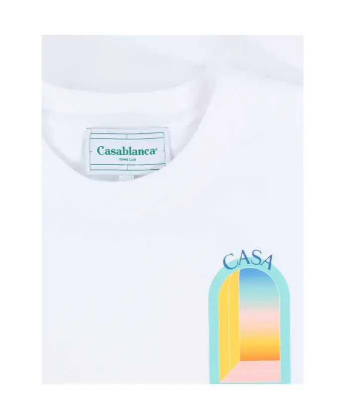Подчеркните свой повседневный стиль с помощью этой белой мужской футболки Casablanca 'L'Arc Colorè'. Эта хлопковая футболка с принтом на груди и спине имеет свободный крой и классический ребристый круглый вырез.