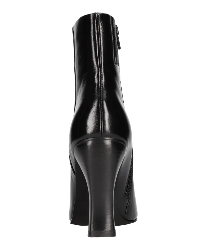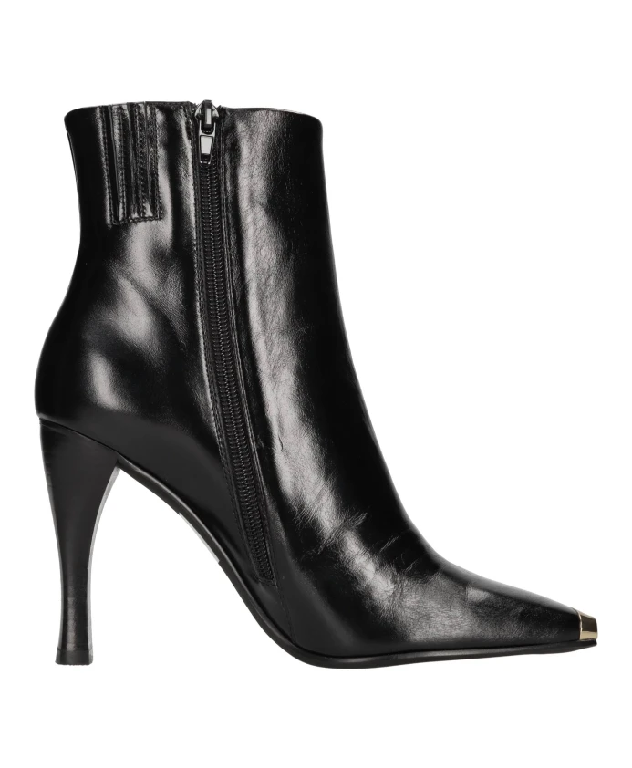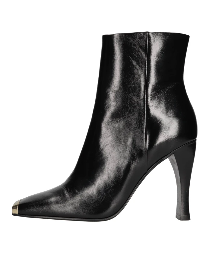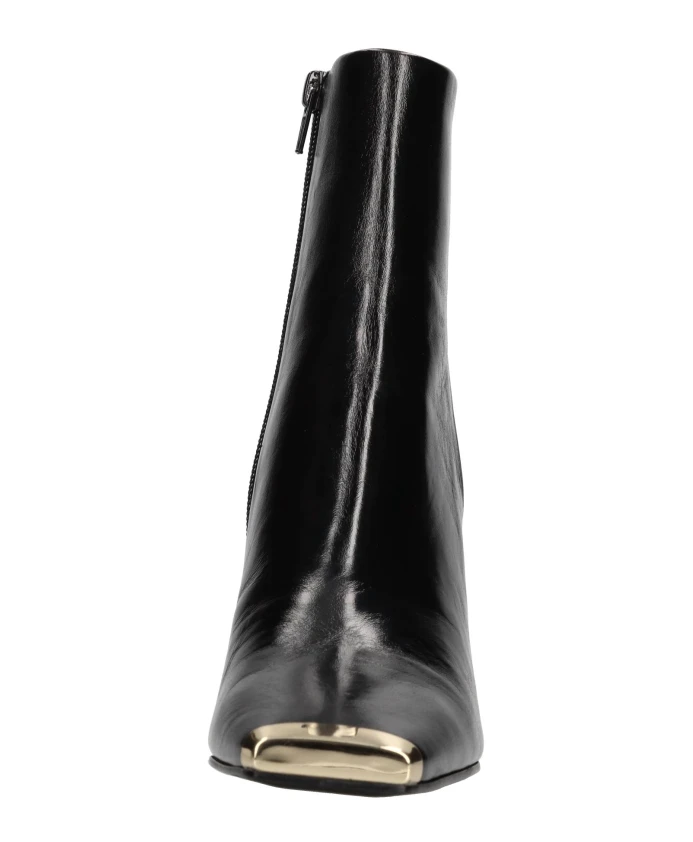 Подчеркните свой стиль с помощью этих ботинок Jeffrey Campbell из блестящей кожи. Эти ботильоны на каблуке с резиновой подошвой, кожаной подкладкой и мыском с золотистой отделкой идеально подойдут для модниц.